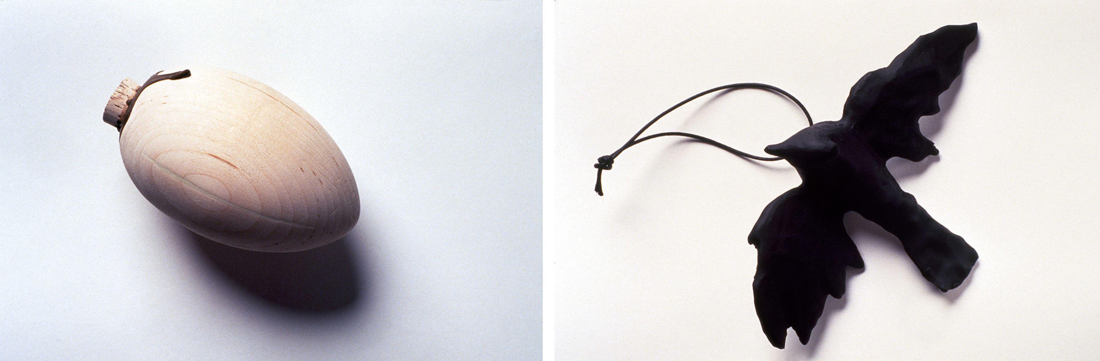 Left: Mike Kelley (American, 1954–2012). Hibernating Egg: Postoperative State, 1994. Birchwood, cork, glue, and wood putty, 2 3/4 x 2 1/2 x 4 1/2 in. (7 x 6.4 x 11.4 cm). The Metropolitan Museum of Art, New York, Purchase, Anonymous Gift, 1995 (1995.42f). © 2023 Artists Rights Society (ARS), New York. Right: Ross Bleckner (American, 1949). Untitled, 1994. Painted plastic, cord, and metal, 2 x 7 1/4 x 4 1/4 in. (5.1 x 18.4 x 10.8 cm). The Metropolitan Museum of Art, New York, Purchase, Anonymous Gift, 1995 (1995.42b)