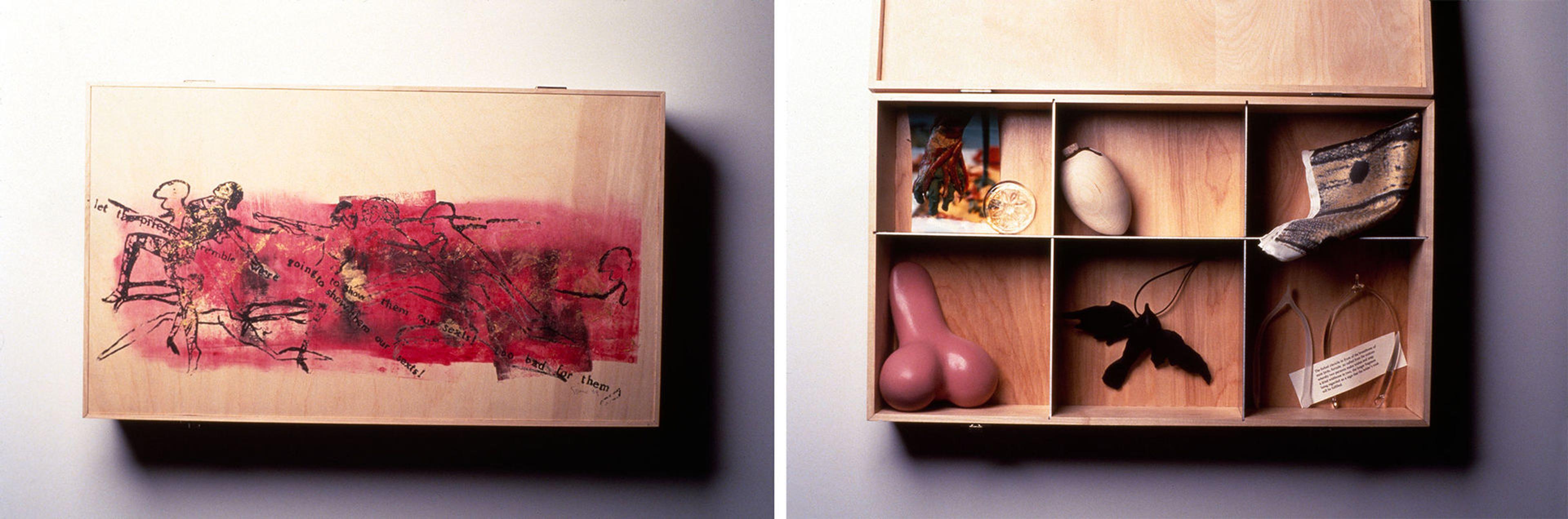 Left: Nancy Spero (American, 1926–2009). ACT UP Art Box: To the Revolution, 1994. Birchwood, ink, paint, 5 in. x 23 1/2 in. x 13 1/2 in. (12.7 x 59.7 x 34.3 cm). The Metropolitan Museum of Art, New York, Purchase, Anonymous Gift, 1995 (1995.42a) © Estate of Nancy Spero. Right: Various artists. ACT UP Art Box, 1993–94. Mixed media, ed. 74/95, box: 5 in. x 23 1/2 in. x 13 1/2 in. (12.7 x 59.7 x 34.3 cm). The Metropolitan Museum of Art, New York, Purchase, Anonymous Gift, 1995 (1995.42a–j)
