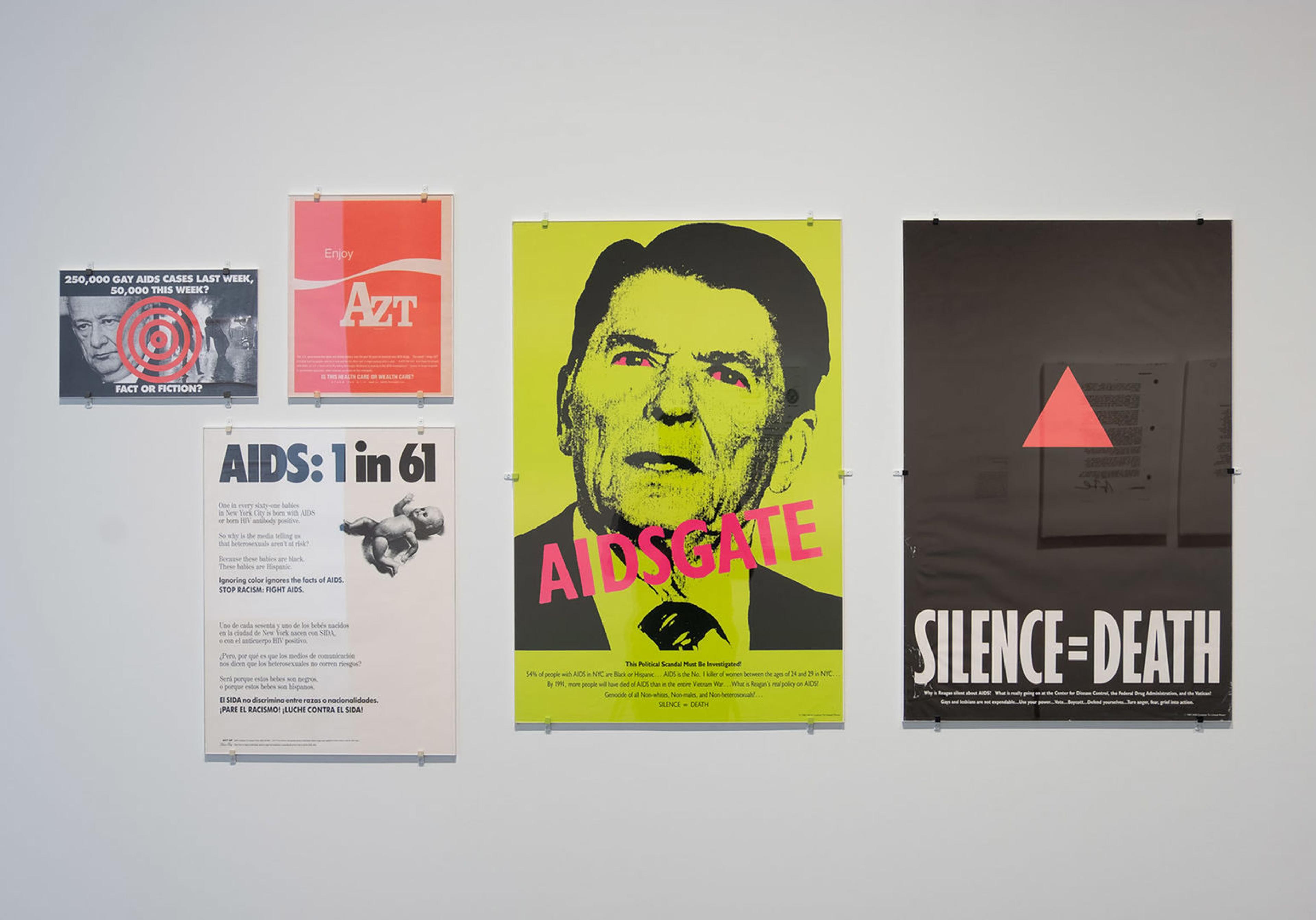 Installation view from Everything is Connected: Art and Conspiracy, which was on view at The Met Breuer from September 18, 2018–January 6, 2019, featuring various posters by artists in ACT UP.
