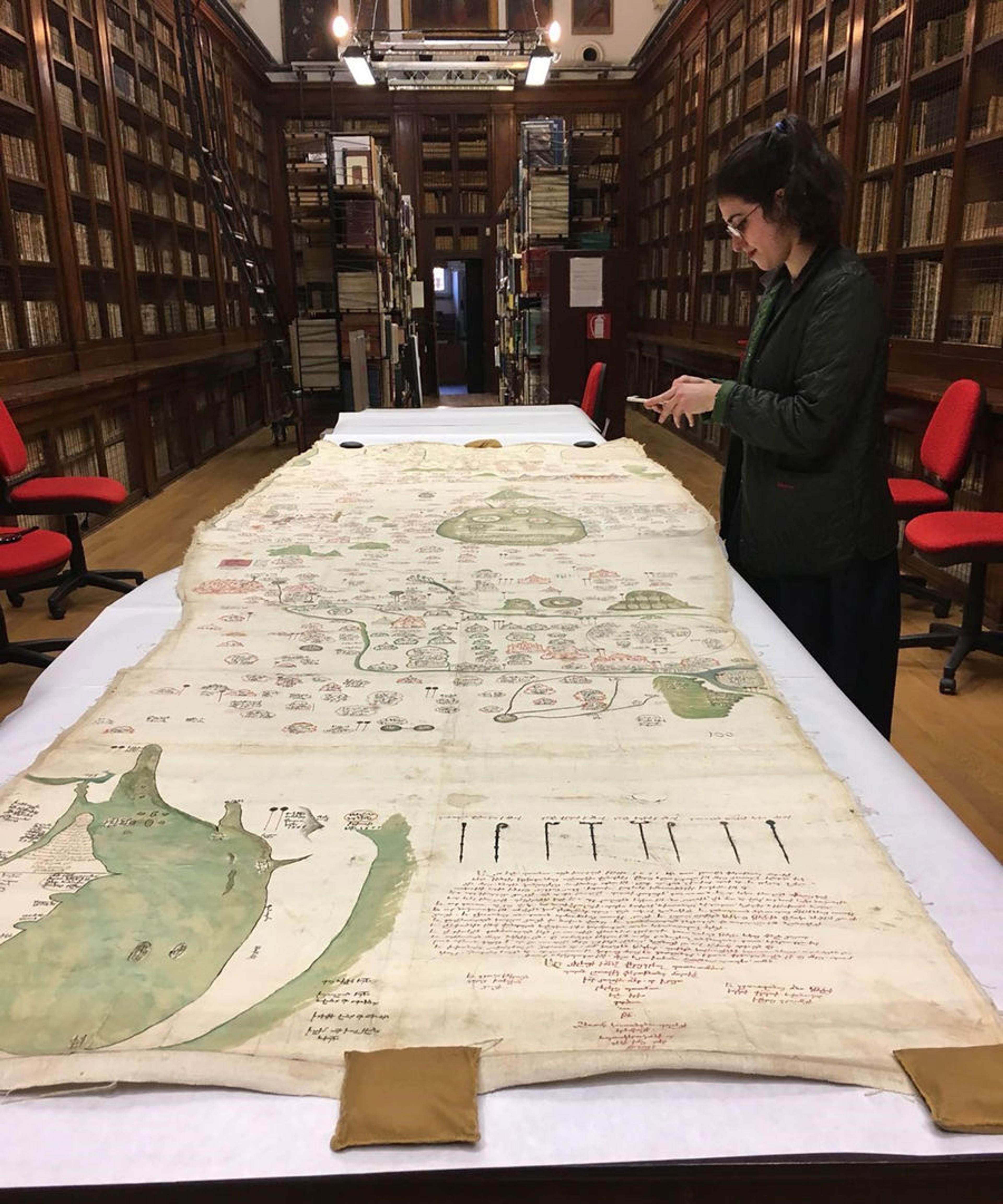 Since its "discovery" in the University Library, the map has been published, reproduced in facsimile, and occasionally unrolled for scholars to examine. I had the privilege to admire it in March 2016, when I went to Bologna to participate in preliminary discussions for the loan of the map. In the spring of 2018, the map was restored for the first time in its history in preparation for its first transatlantic flight. A non-invasive conservation procedure was performed to consolidate losses in the paper and to reattach the eight sheets of paper to their muslin backing. The entire restoration process was completed by Melania Zanetti in three weeks and in full view of the public at the Palazzo Poggi Museum.