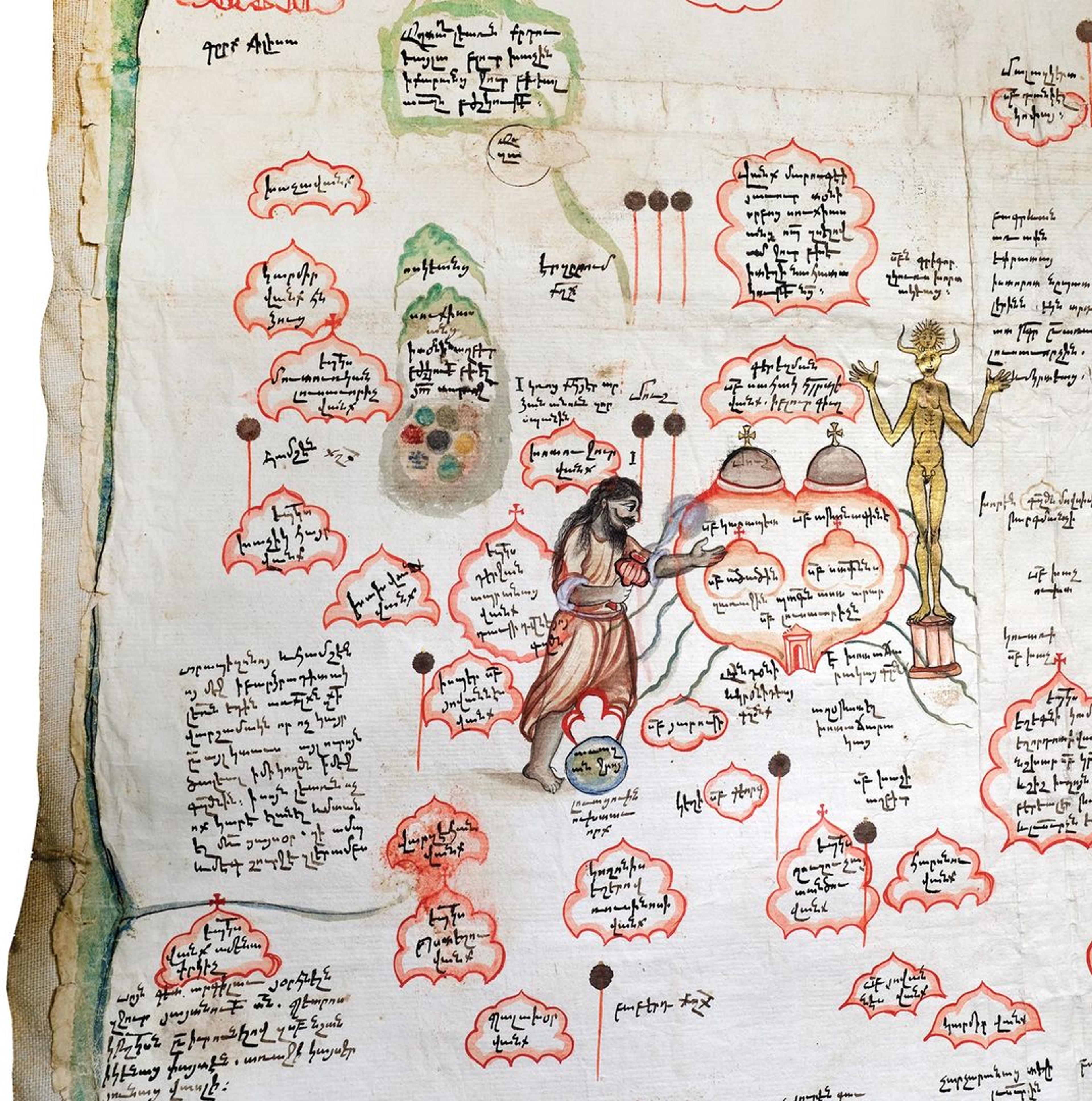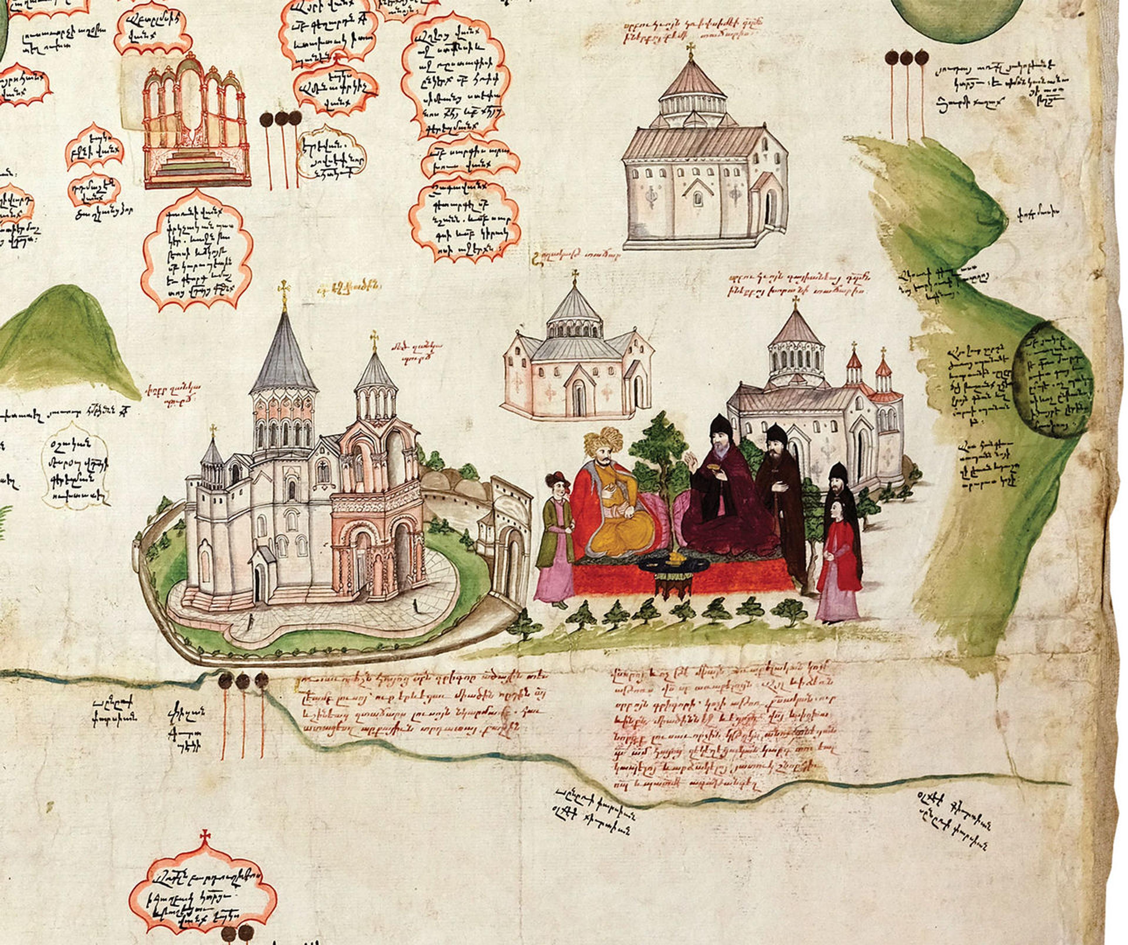 This luxurious large map shows the expansiveness of the Armenian Church in the late seventeenth century. K‘eomiwrchean illustrated nearly eight hundred sites on the map, including the major Armenian ecclesiastical centers: the catholicosates of Etchmiadzin, Gandzaar, Aght‘amar, and Cilicia; and the patriarchates of Jerusalem and Constantinople. Also depicted are important churches and sites in the Ottoman Empire—all the way from Nishapur, the location of the martyrdom of Lewondeank, to the churches and monasteries of Crimea.