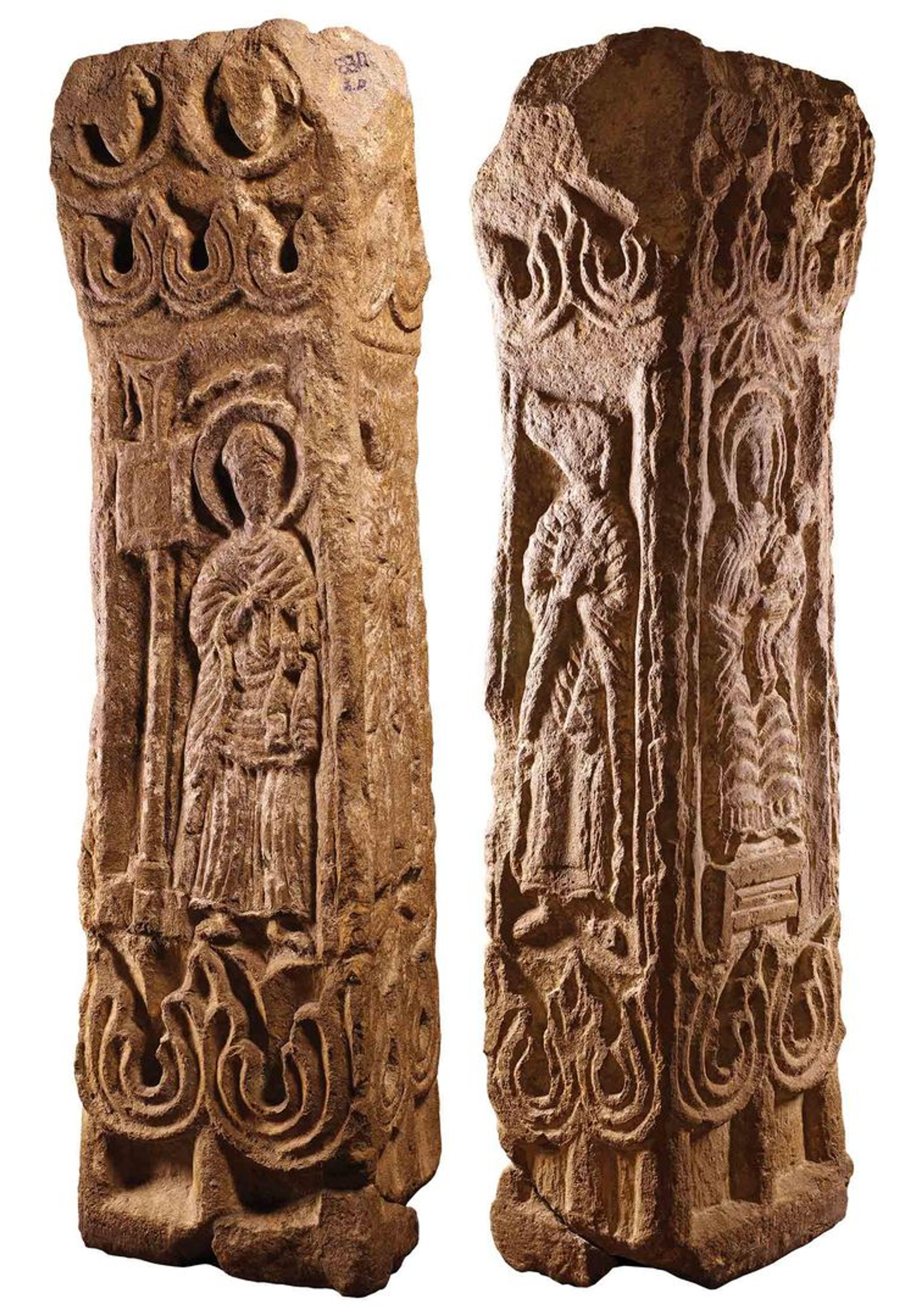 This stela, one of the earliest surviving works of Armenian Christian art, depicts a haloed Saint Gregory the Illuminator (above left). On one side (above right), he is faced by an animal-headed man in courtly robes, who is likely an image of King Tiridates. The king's animal head signifies his descent into madness, when, consumed by love, he murdered the beautiful young nun Hripsime for spurning his advances. Summoned from prison, Gregory the Illuminator cured the king of his malady, which prompted Tiridates to recognize the power of Christianity.