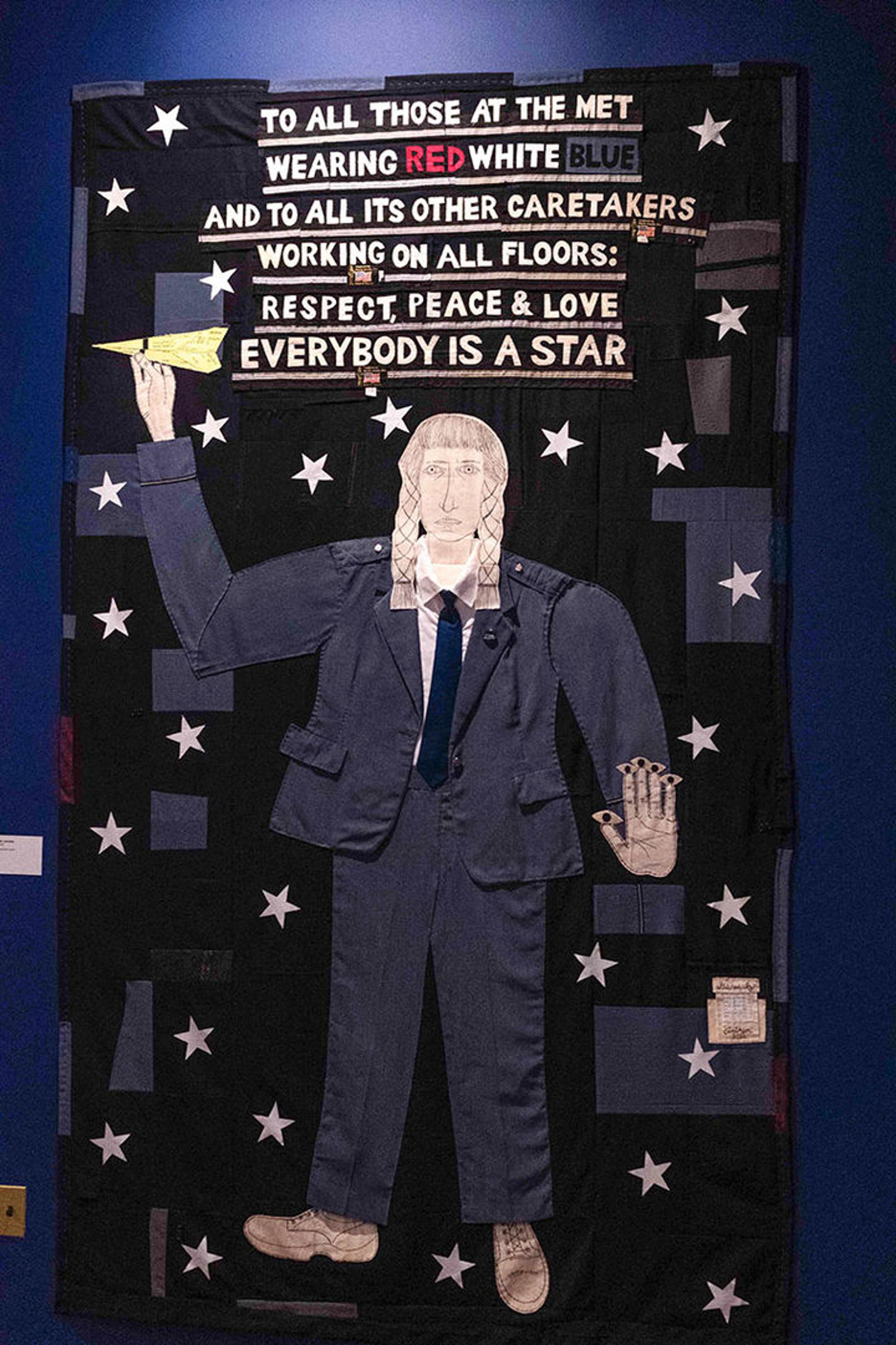 Anthem is a self-portrait I created to celebrate my twenty-seven years of working as a security guard at The Met and is dedicated to all the people I work alongside in the Security Department as well as all the other departments in the Museum. It is made completely from recycled Met security guard uniforms except for the yellow airplane. The face, hands, shoes, and text were all made from uniform pockets. The text, at the top of the piece, was sewn onto the insides of uniform pants waistbands. The twenty-seven stars, representing the number of years I’ve worked at the Museum, were cut from the white shirts all guards wear as part of their standard apparel. My piece also references a work I’d made for a previous employee art show in 2014—inspired by my struggles with getting to work on time—a giant four-by-eight-foot paper airplane pieced together from more than three hundred (not all my own) small slips of yellow paper called “Late Notices” that security staff receive when they’re late to work. As an accompaniment to the sculpture, I also had late slips printed onto fabric to create a late-slip dress that I wore to the 2014 show’s opening; the much smaller airplane I’m holding in Anthem was made from leftover fabric from the 2014 dress.
