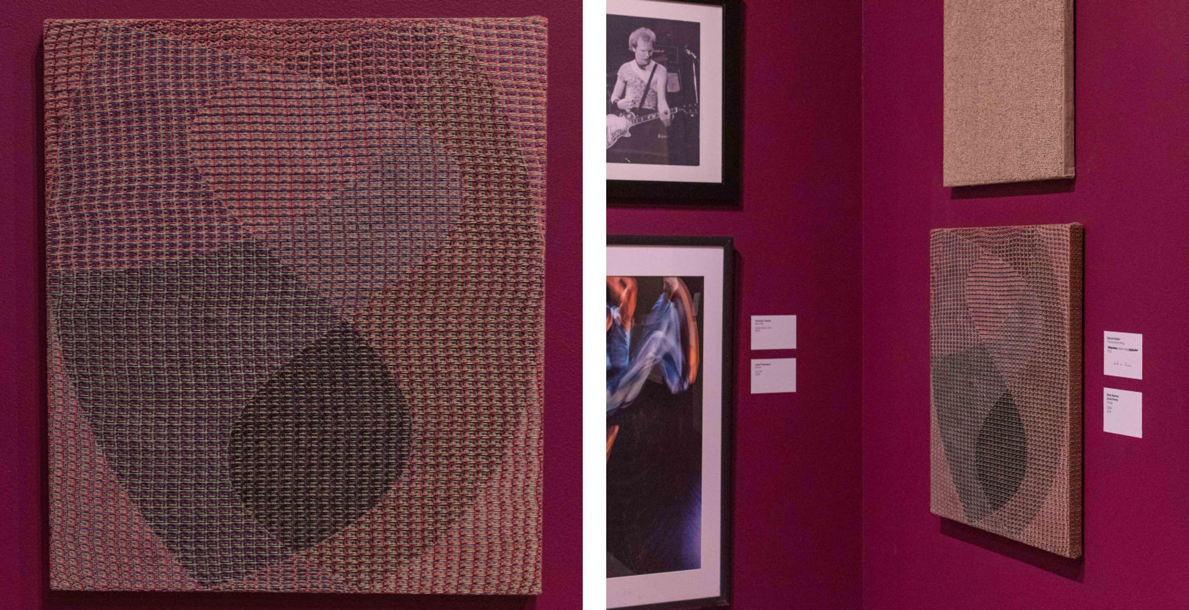 The work draws a correlation between weaving and digital color space, which are both based on Cartesian systems. The hand-woven fabric consists of red, green, and blue threads, like pixels in a screen. To make the composition, different ratios of those three colors are covered in black paint using a brush the same size as a single thread. The piece is titled based on those three primary colors in order of their predominance in the piece.