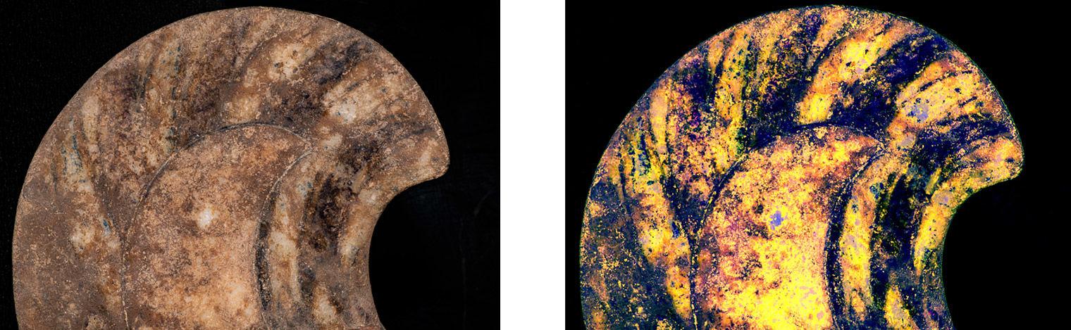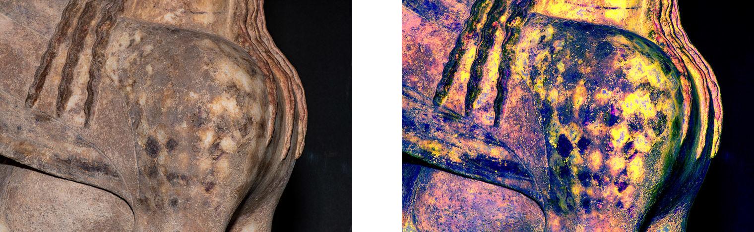 To recreate the armature of the feather patterns on the breast and wings of the sphinx, as well as the application of the colors themselves, Ulrike Koch-Brinkmann and Vinzenz Brinkmann’s team relied on rich scientific findings by The Met’s Imaging team, including multispectral photographs by Dorothy Abramitis, as well as ultraviolet-visible absorption spectroscopy (UV-VIS) by Heinrich Piening, which were supplemented by further photographs in ultraviolet (UVL) and infrared (VIL) fluorescence and false color (iDStretch app) captured by Vinzenz Brinkmann.