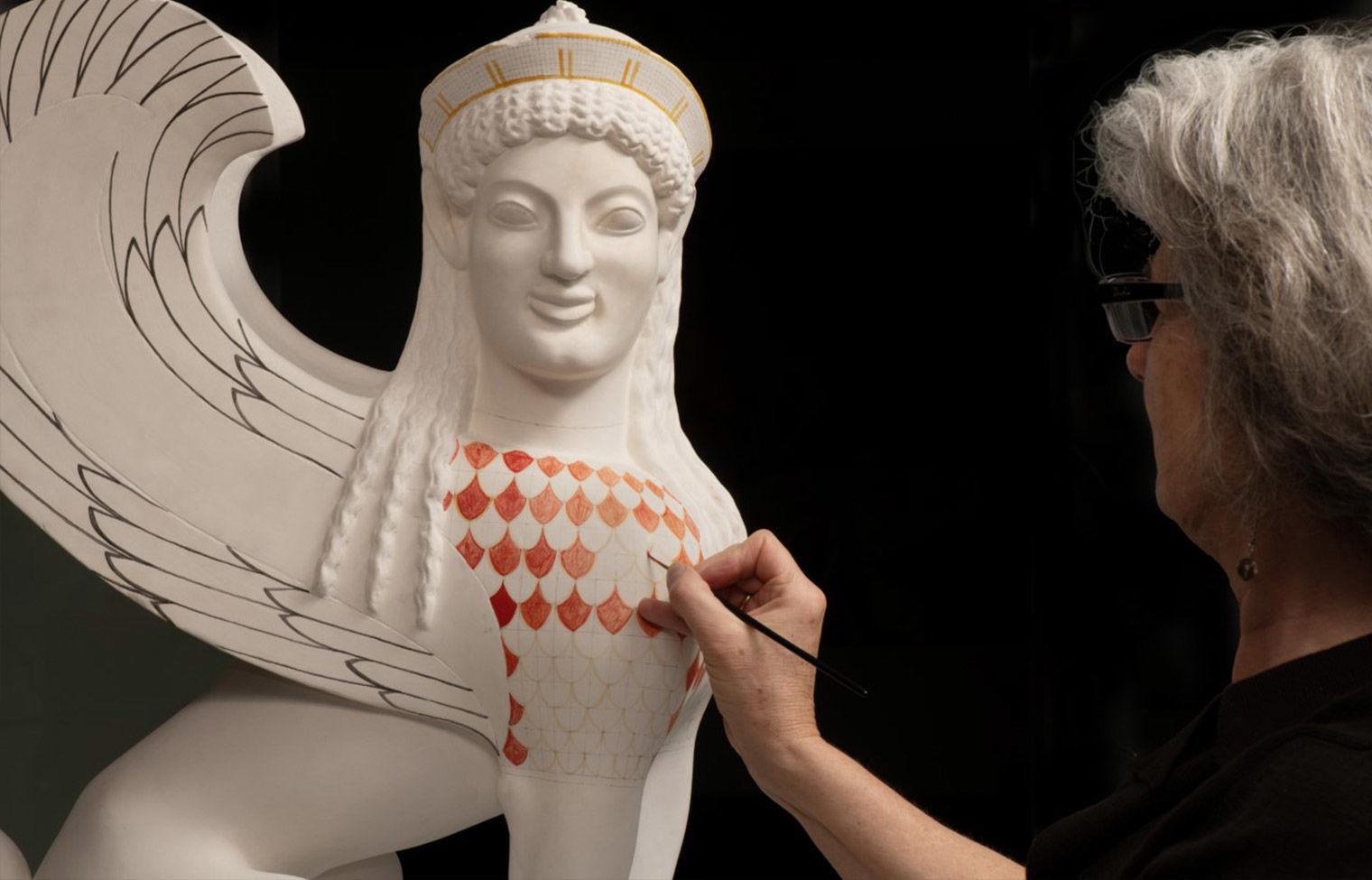 In 2021, The Metropolitan Museum's Imaging Department, under the direction of Scott Geffert, successfully measured the sphinx of the Greek funerary monument of Megakles in three dimensions with great detail using photogrammetry. This data was processed by Ralf Deuke in Munich and passed on to the company Voxeljet in southern Germany, where the sphinx was built in two components made of Plexiglas powder (polymethylmetacrylate) in their 3D printers. Ulrike Koch-Brinkmann carefully added to this copy at selected minor breakage points and then covered it with several superfine layers of marble stucco and smoothed it. The result of this collaborative effort, a likely reconstruction of the sphinx in its original form and color, is on view in the special exhibition Chroma: Ancient Sculpture in Color.