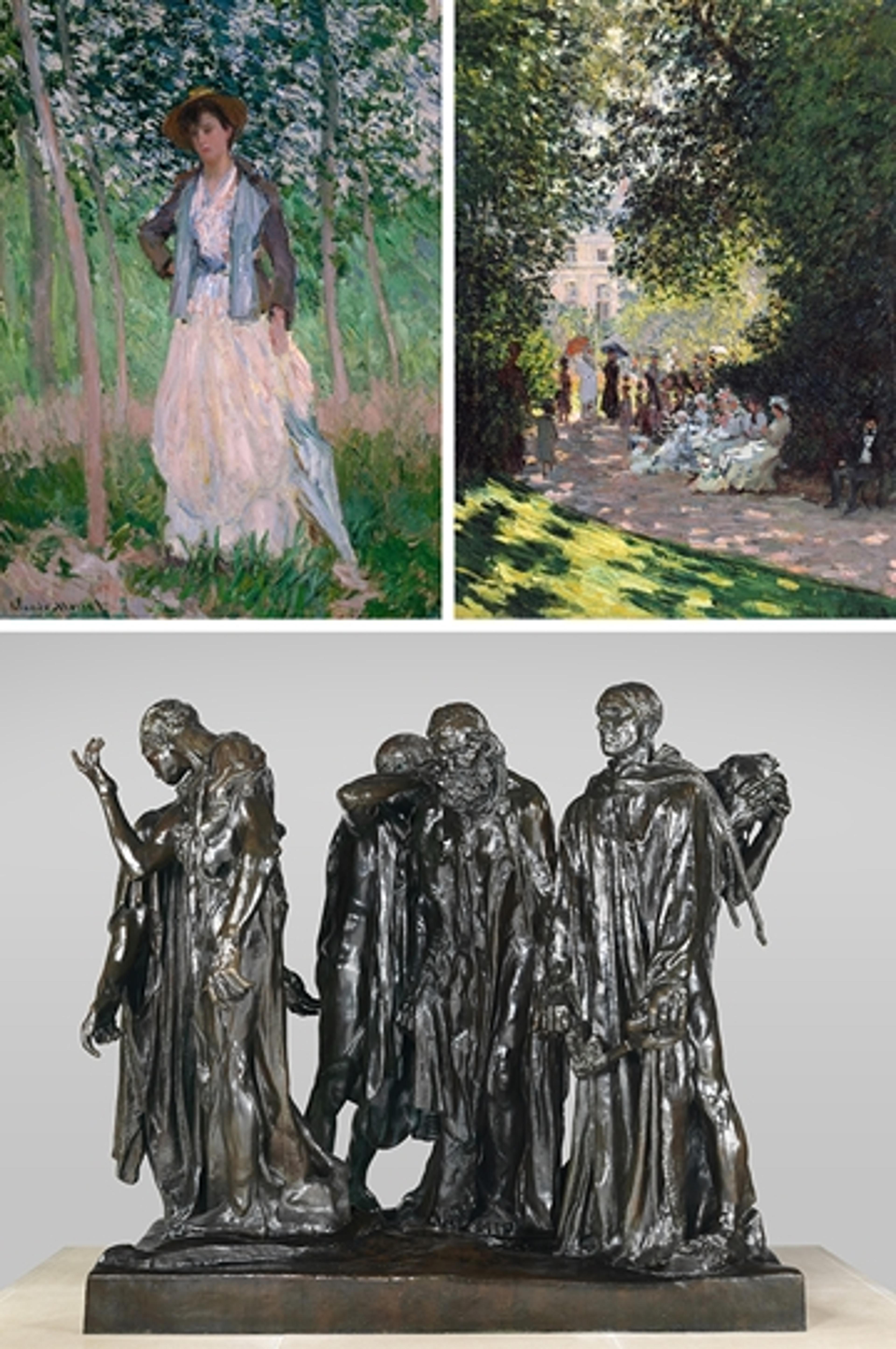 Right (clockwise from top left): Claude Monet (French, 1840–1926). The Stroller (Suzanne Hoschedé, later Mrs. Theodore Earl Butler, 1868–1899), 1887. Oil on canvas, 39 5/8 x 27 3/4 in. (100.6 x 70.5 cm). The Metropolitan Museum of Art, New York, The Walter H. and Leonore Annenberg Collection, Bequest of Walter H. Annenberg, 2002 (2003.20.7). Claude Monet (French, 1840–1926). The Parc Monceau, 1878. Oil on canvas, 28 5/8 x 21 3/8 in. (72.7 x 54.3 cm). The Metropolitan Museum of Art, New York, The Mr. and Mrs. Henry Ittleson Jr. Purchase Fund, 1959 (59.142). Auguste Rodin (French, 1840–1917). The Burghers of Calais, modeled 1884–95, cast 1985. Bronze, 82 1/2 x 94 x 95 in. (209.6 x 238.8 x 241.3 cm). The Metropolitan Museum of Art, New York, Gift of Iris and B. Gerald Cantor, 1989 (1989.407)