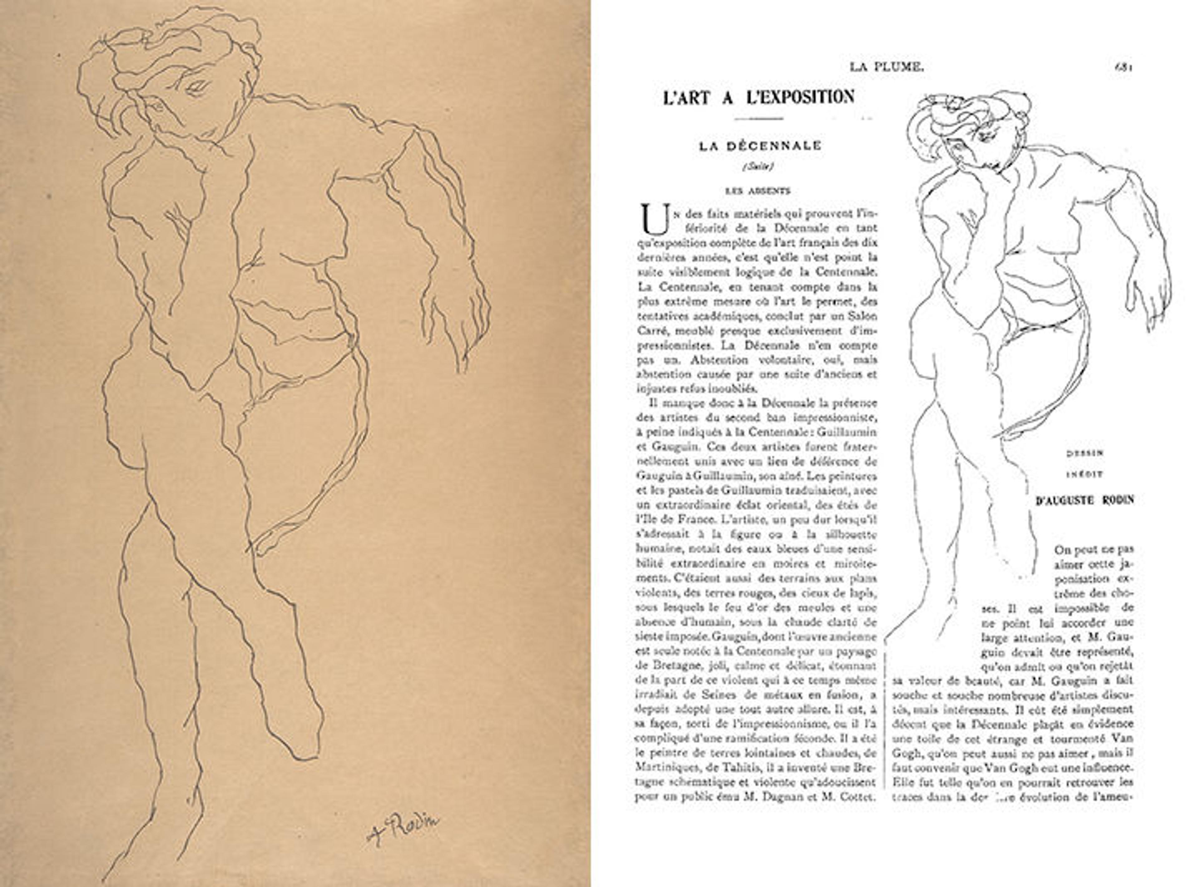 Left: Anonymous; formerly attributed to Auguste Rodin (French, 1840–1917). Copy after a reproduction of a Rodin drawing, not dated. Pen and black ink, 14 5/16 x 9 1/4 in. (36.4 x 23.4 cm). The Metropolitan Museum of Art, New York, Gift of Gregoire Tarnopol, 1971 (1971.253.4). Right: Reproduction of a Rodin drawing in La Plume no. 278 (November 15, 1900), 681. Image courtesy Gallica, the Bibliothèque nationale de France digital library