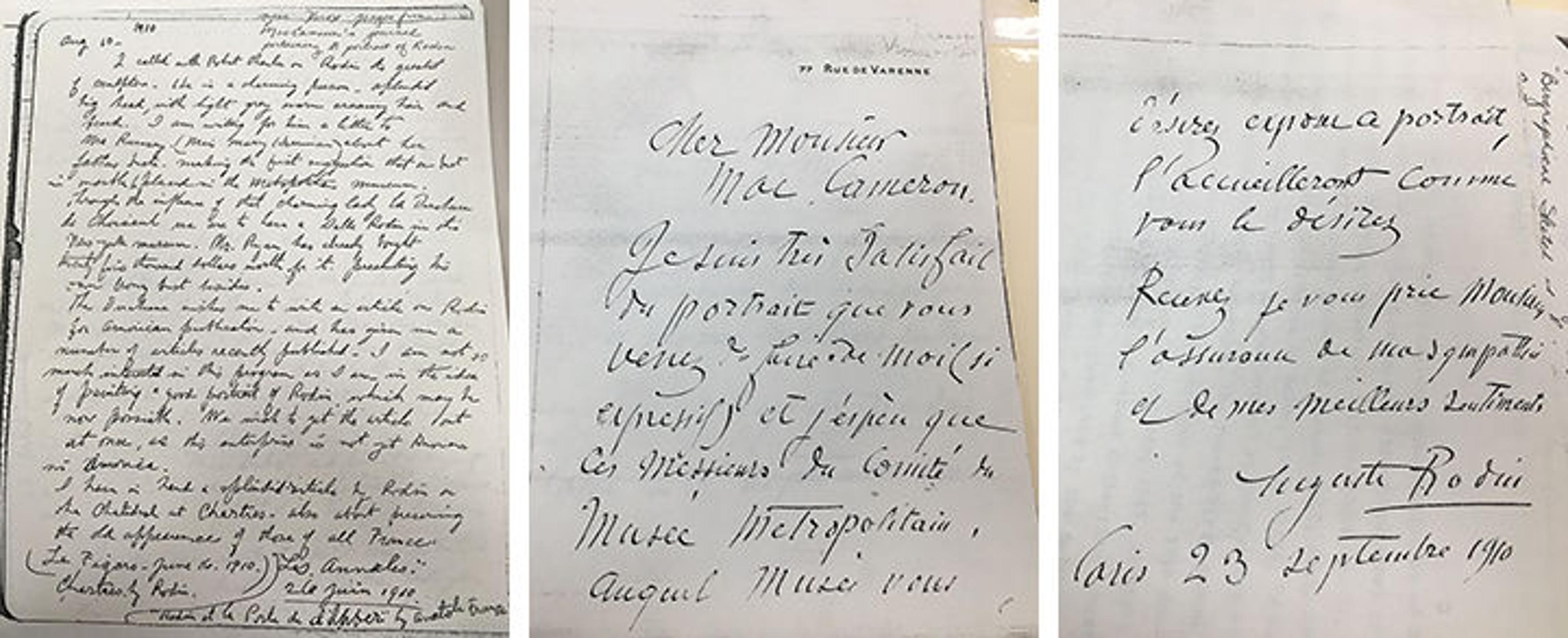 Left: Photocopy of page from Robert MacCameron's journal, August 10, 1910. Archives of the American Wing, The Metropolitan Museum of Art, New York. Middle and Right: Photocopy of letter from Auguste Rodin to Robert MacCameron, September 23, 1910. Archives of the American Wing, The Metropolitan Museum of Art, New York