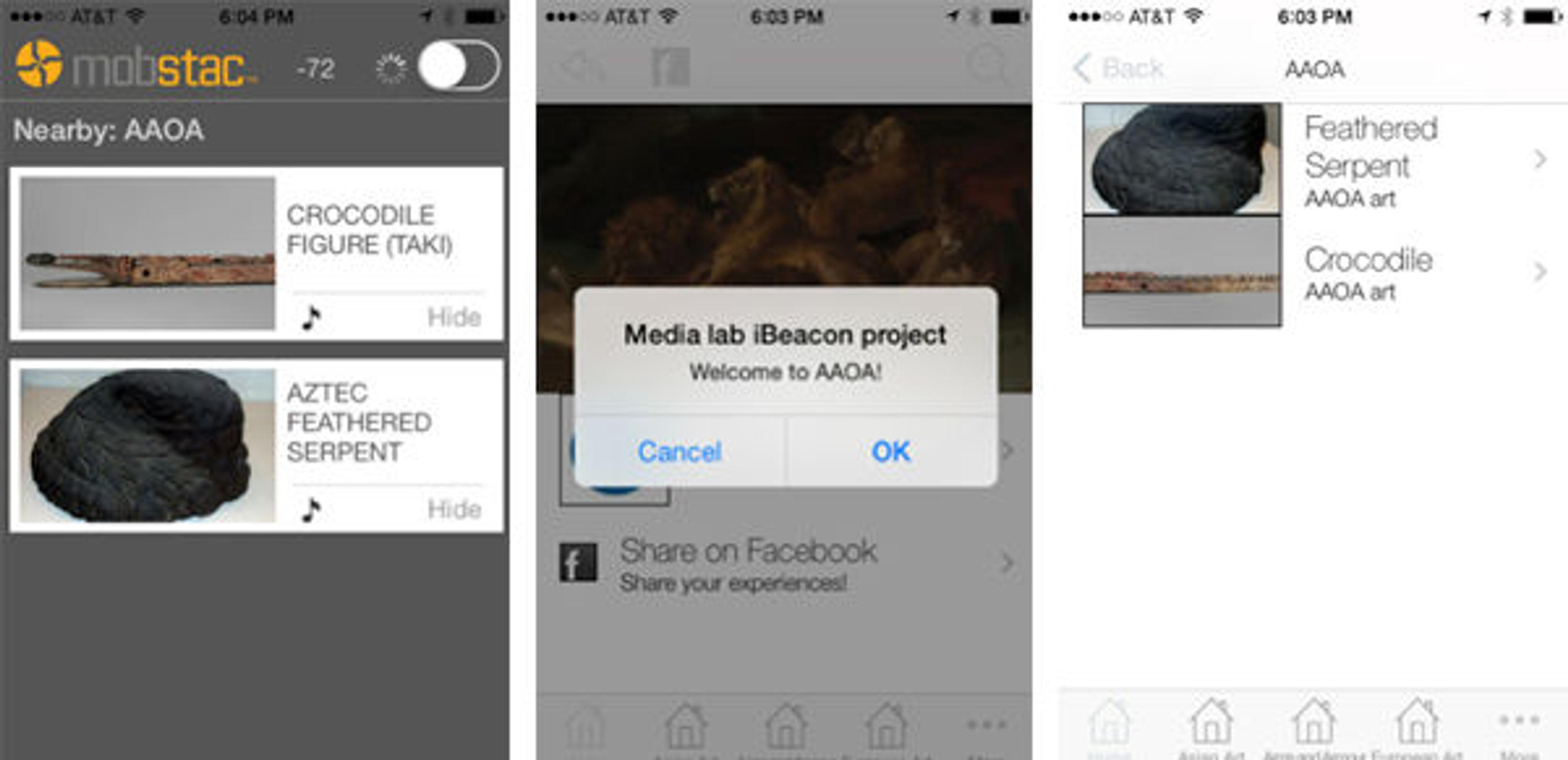 Fig. 6. To compare the variety of tools to use with beacons, two technology solutions were employed: an app developed by Mobstac (left), and a free app, SDK, by Beacondo (center and right).