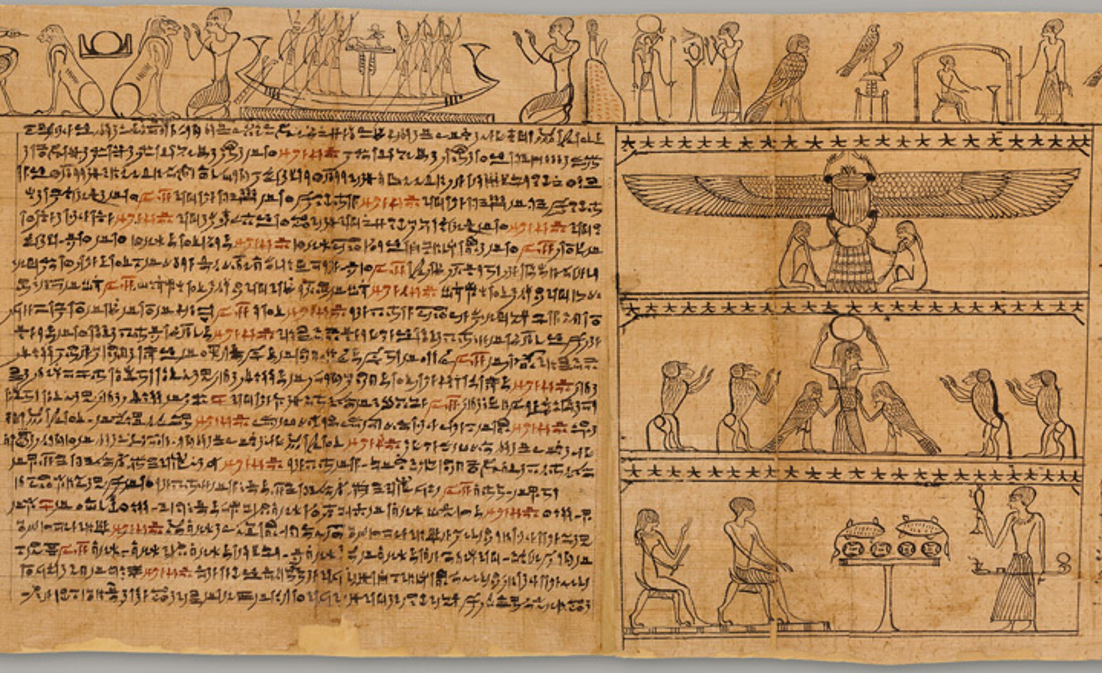 Visible here is one column of text, a band of images that runs across the top, and one vignette that takes up the height of the papyrus. Note the texts written in red.