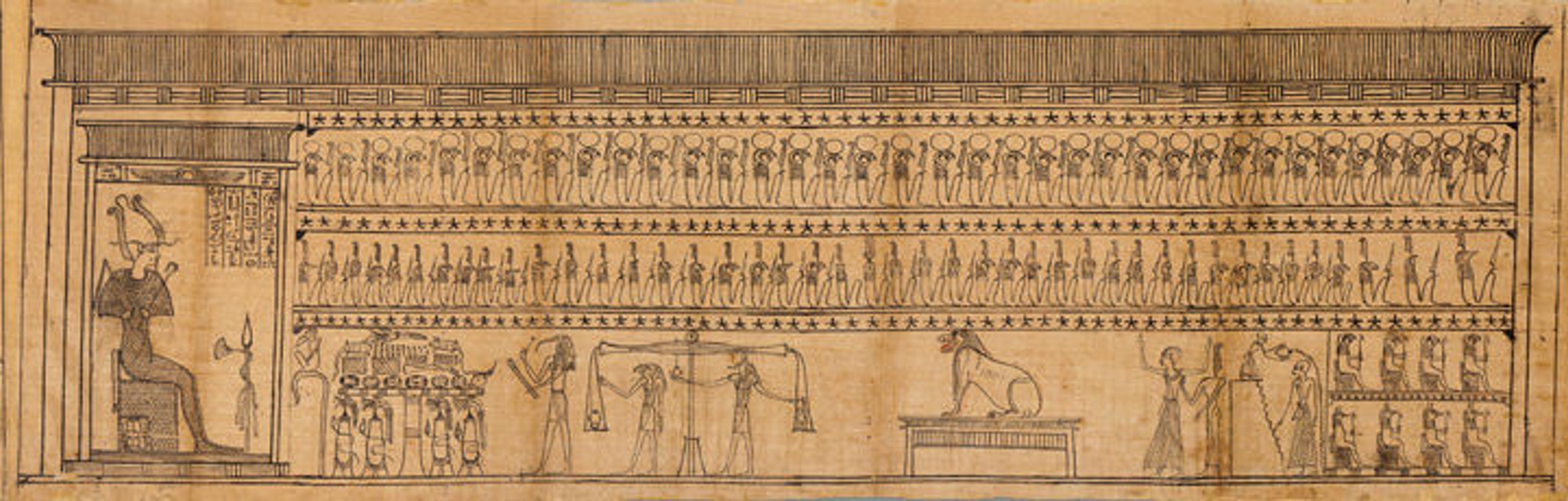 Osiris (far left) presides over the Judgment Scene, which determines whether Imhotep (pictured twice on the right, once having water poured over him and once with his arms raised) will live forever or have his heart eaten by the monster Ammut (the creature with the red tongue on top of the shrine, center right). Book of the Dead of the Priest of Horus, Imhotep (Imuthes). Early Ptolemaic Period, ca. 332–200 B.C. From Egypt; Probably from Middle Egypt, Meir (Mir). Papyrus, ink; Approximate measurements (framed): L. 219 m (71 ft. 10 3/16 in); H. 35 cm (1 ft. 1 3/4 in.). Length previously estimated at 63 ft. (192 m). The Metropolitan Museum of Art, New York, Gift of Edward S. Harkness, 1935 (35.9.20a–w)