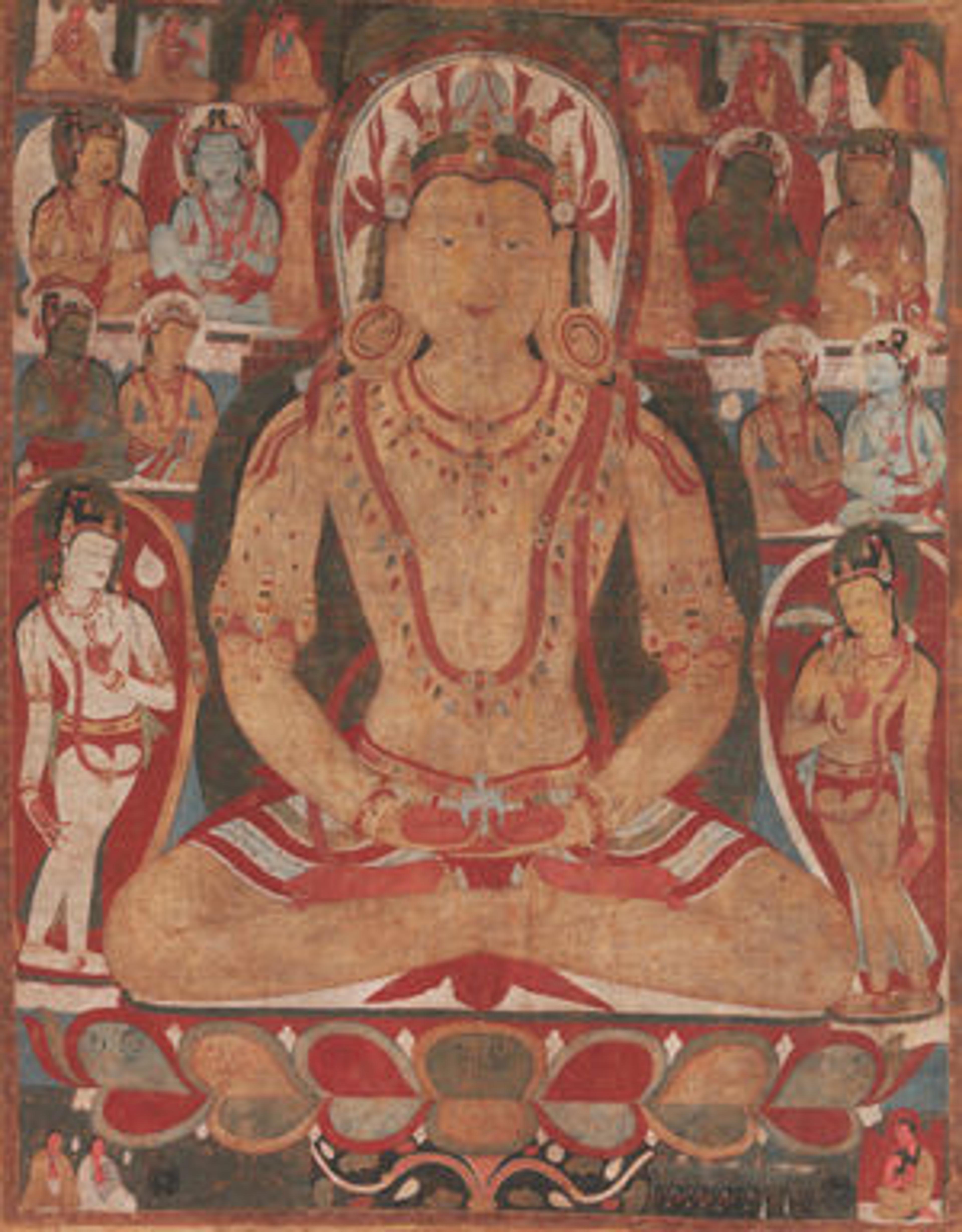 Buddha Amitayus Attended by Bodhisattvas. Tibet, 11th or early 12th century. Mineral and organic pigments on cloth. The Metropolitan Museum of Art, New York, Rogers Fund, 1989 (1989.284)