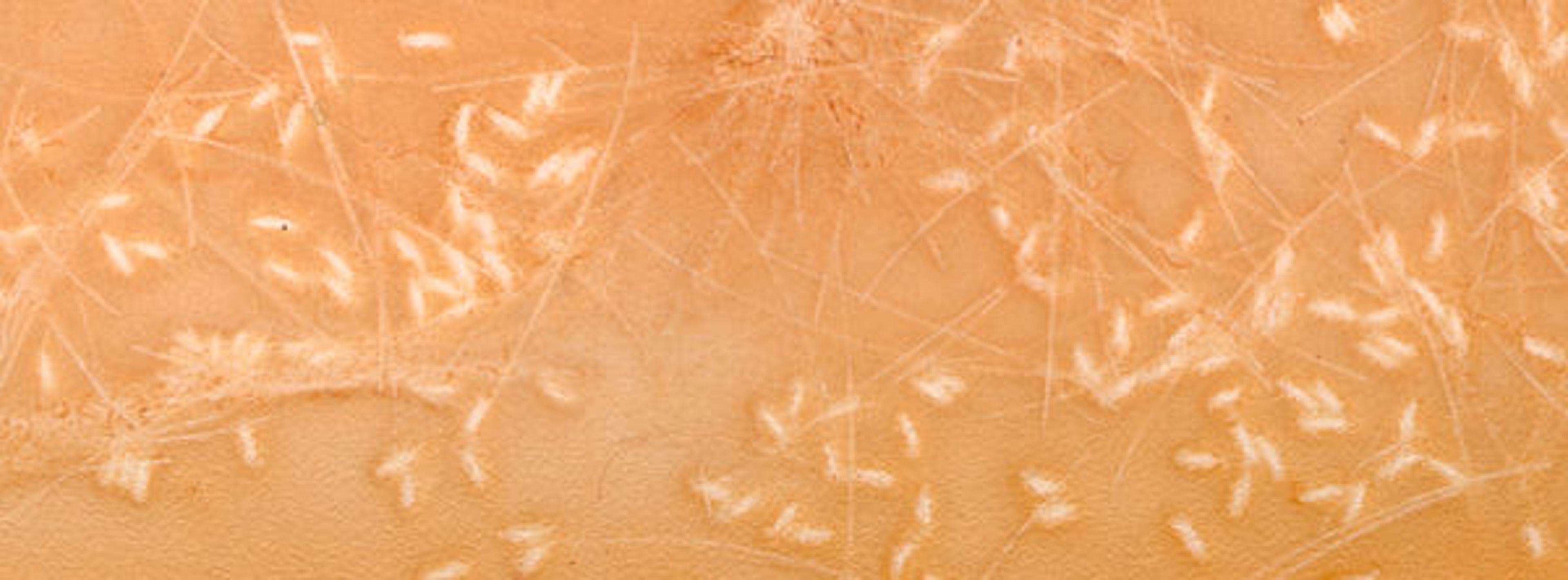 Detail view of Pipes highlighting the use of hair, rice, and salt granules to add texture to the painting's surface