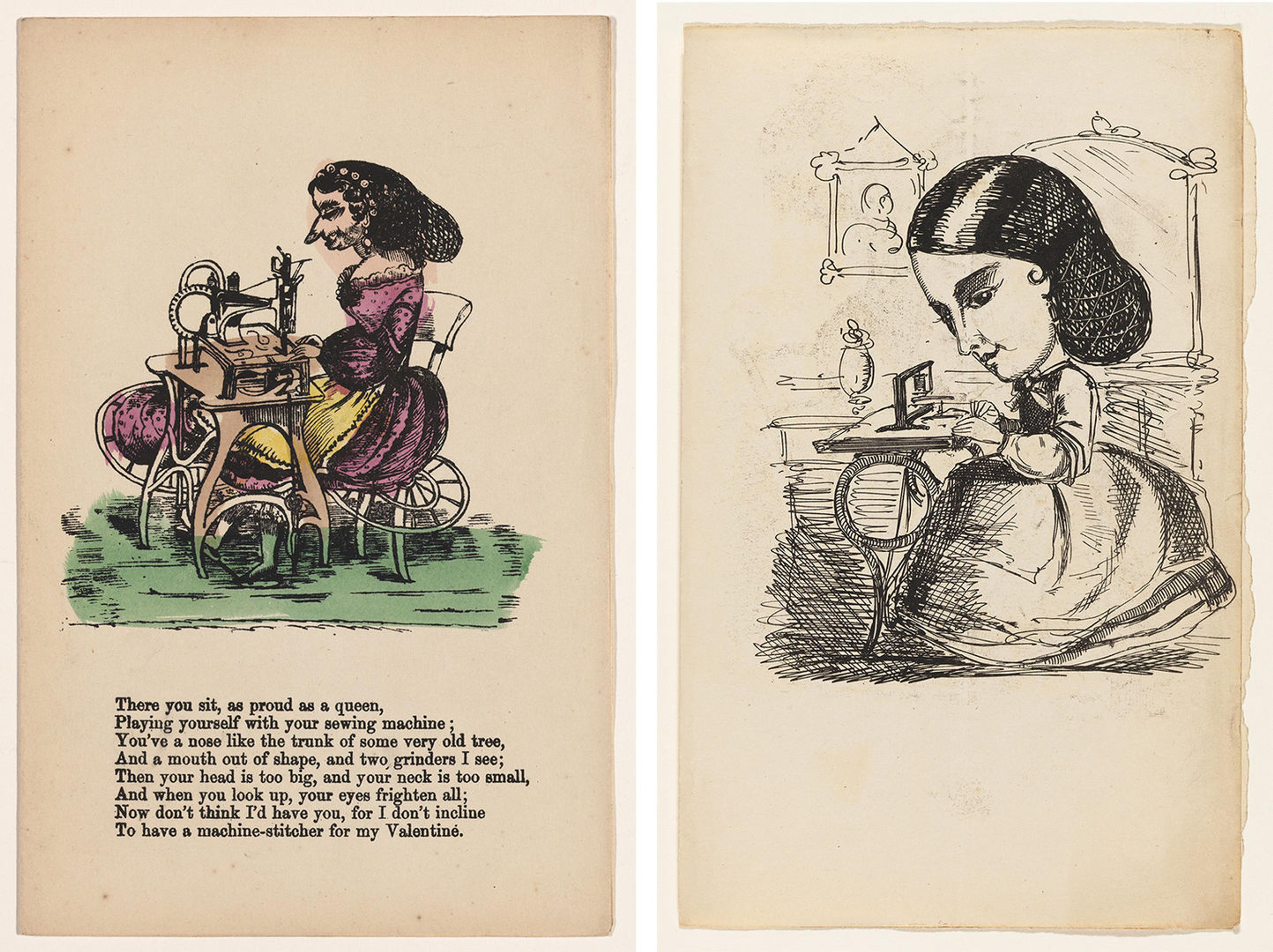 Left: British, 19th century. Comic Valentine (woman at sewing machine), ca. 1850. Hand colored wood engraving, 7 1/2 × 4 3/8 in. (19 × 11 cm). The Metropolitan Museum of Art, New York, Gift of Mrs. Richard Riddell, 1981 (1981.1136.479). Right: British, 19th century. Comic Valentine original illustration: Sewing Machine, ca. 1860. Ink, 7 7/8 × 5 in. (20 × 12.5 cm). The Metropolitan Museum of Art, New York (Ref.ComicValentine.1)