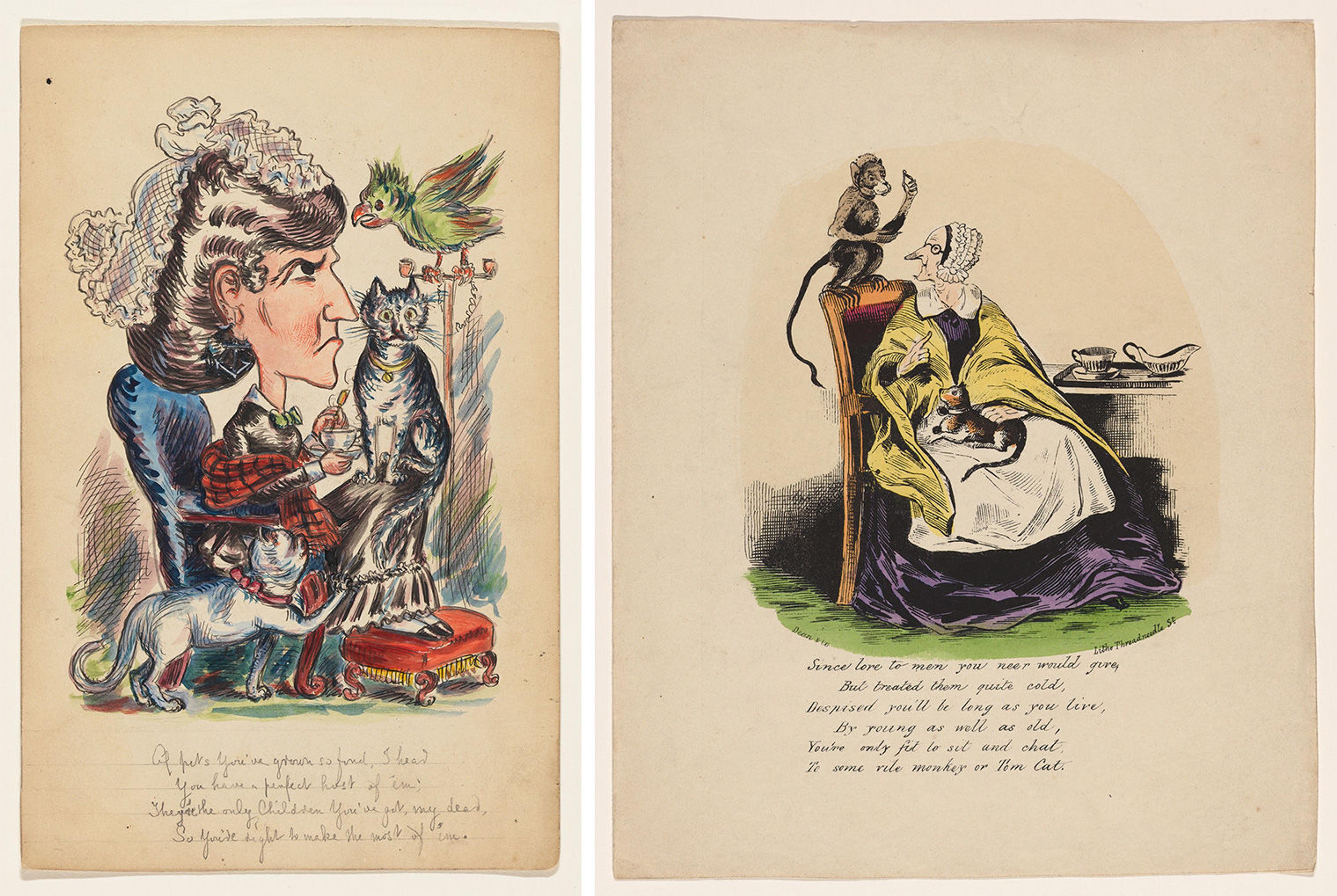 Left: N. Clayton (British, 19th century). Original illustration for a comic Valentine: Old Maid with parrot and cat, ca. 1860. Hand-colored (watercolor) ink drawing on heavy stock, with poetry written in graphite script, 8 1/2 × 5 1/2 in. (21.5 × 14 cm). The Metropolitan Museum of Art, New York (Ref.Clayton.1). Right: British, 19th century. Publisher: Dean and Co. (British). Comic Valentine (Old Maid), ca. 1860. Hand colored lithograph, watercolor, 5 3/4 x 4 in. (14.5 x 10 cm). The Metropolitan Museum of Art, New York, Gift of Mrs. Richard Riddell, 1981 (1981.1136.368)