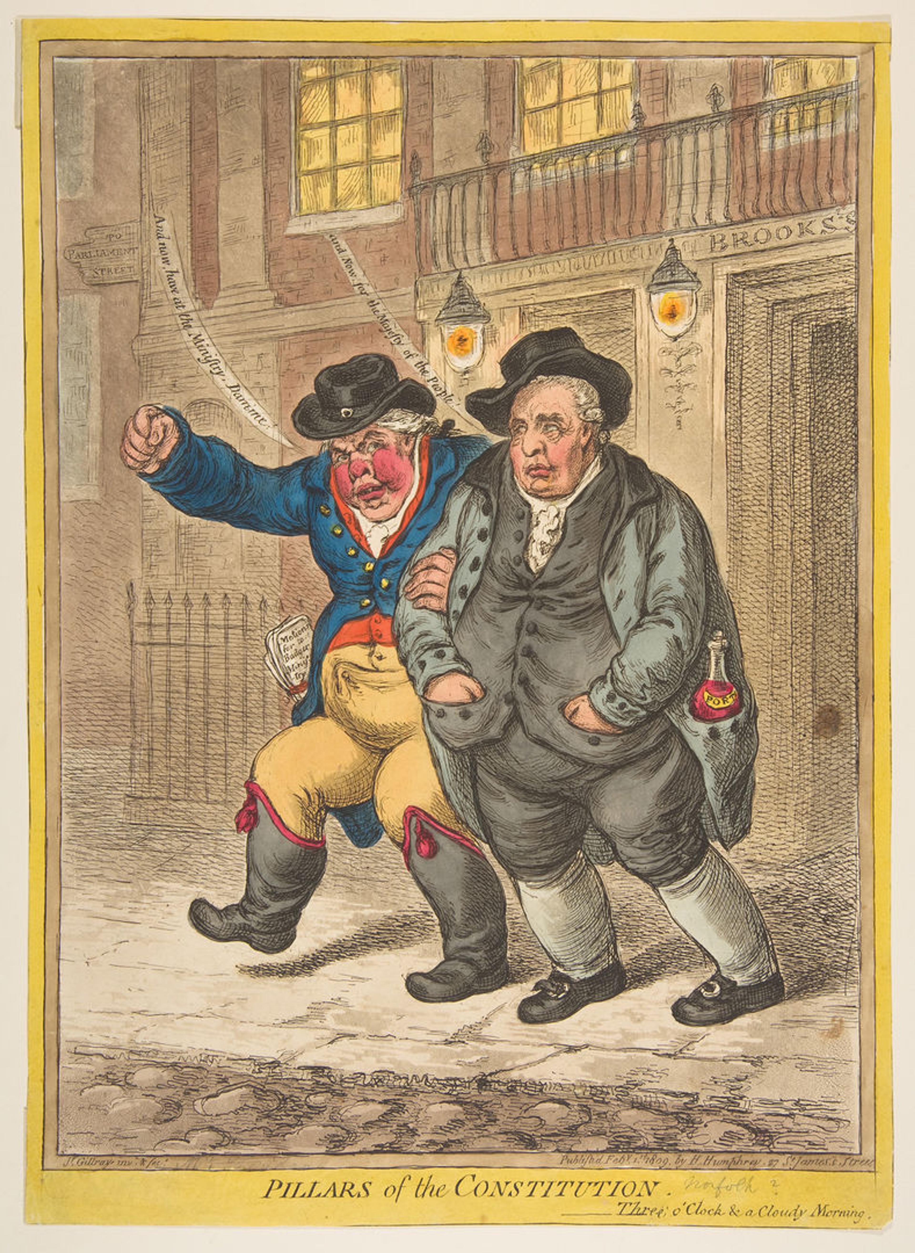 James Gillray (British, 1756-1815). Publisher: Hannah Humphrey (British, ca. 1745-1819). Pillars of the Constitution, February 1, 1809. Hand-colored etching, 13 3/4 x 9 7/8 in. (34.8 x 24.9 cm). The Metropolitan Museum of Art, New York, Harris Brisbane Dick Fund, 1917 (17.3.888-80)