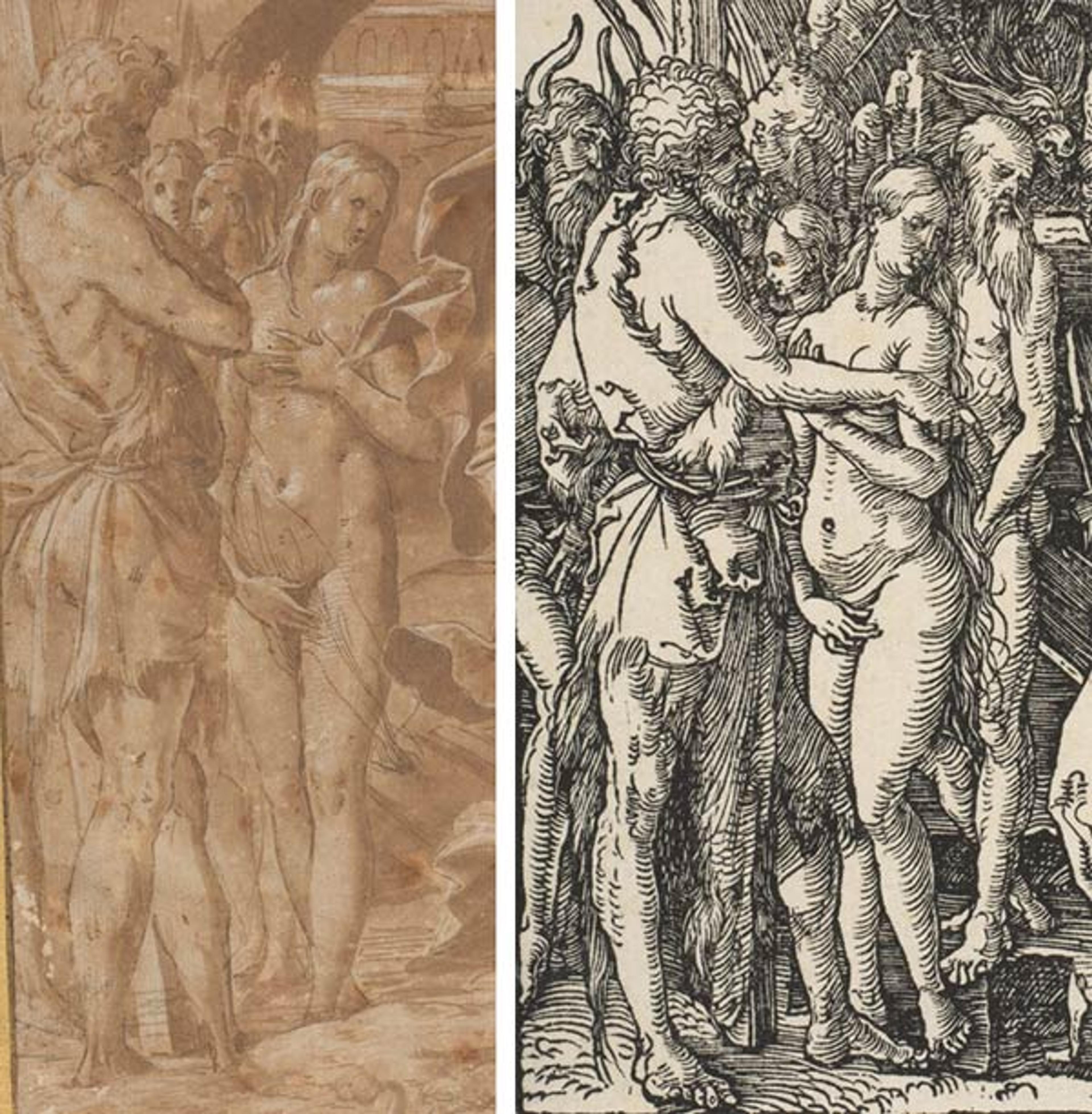 Left: Luca Penni (Italian, 1500/1504–1557). Christ in Limbo (detail of figure group on left), ca. 1547–48. Black chalk, pen and brown ink, brush and brown wash, heightened with white gouache, on paper prepared with pale brown wash. The Metropolitan Museum of Art, New York, Purchase, Brooke Russell Astor Bequest and Harry G. Sperling Fund, 2014 (2014.264). Right: Albrecht Dürer (German, 1471–1528). Christ Descending into Hell, from The Little Passion (detail of figure group on left), ca. 1509. Woodcut. The Metropolitan Museum of Art, New York, Gift of Junius S. Morgan, 1919 (19.73.195)