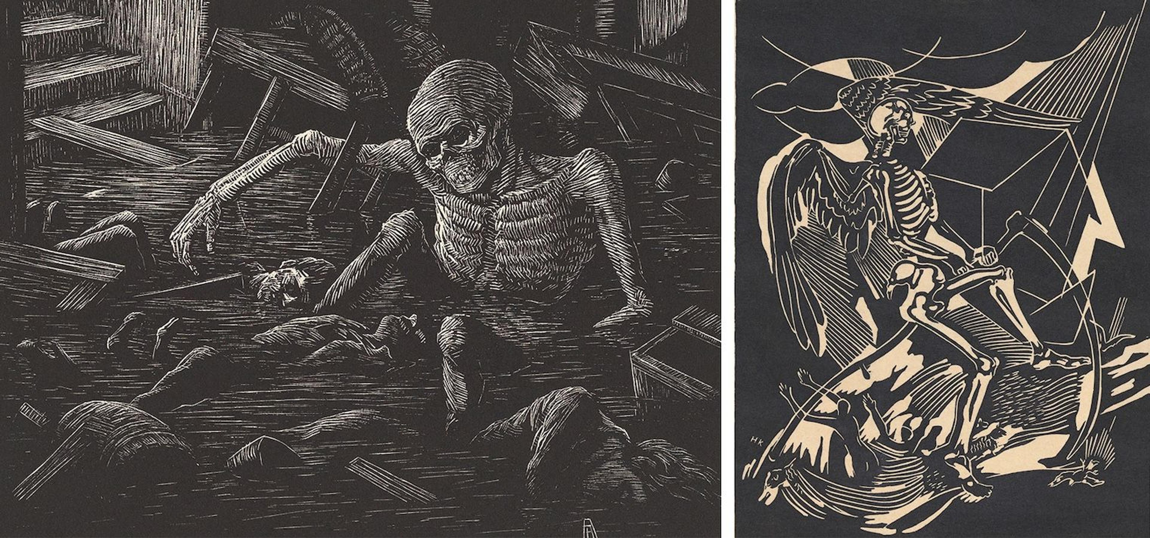 In the 1930s, the United States experienced several other catastrophic floods, such as the Great Mississippi Flood of 1927 and the Los Angeles Flood of 1938. Deluges occupied residents’ minds nationwide, and some artists focused on metaphorical ways of representing the sorrow and loss during these years. Albert Abramovitz (1879–1963), who migrated from Russia and had lived and worked between New York State and California during the 1930s, witnessed these disasters and dedicated more than one artwork to the subject.[7] The artist, known for his stark social commentary, frequently used skeletons and skulls to symbolize the prevalence of death and destruction. His wood engraving titled Flood (ca. 1938) shows the waterlogged interior of a home. Amidst the floating furniture and debris, three lifeless bodies drift in the water—including a prominent skeletal figure in the foreground. Years later, in 1949, Hilda Katz (1909–1999) made her linocut, The Flood, also using a prominent skeleton as a compositional element to symbolize the sorrow of the natural disaster. Katz reinforced this morbid theme by depicting an angel of death holding a scythe in his left hand. The emptiness of the background, adorned solely with a house in the shape of a barn, suggests a rural setting, possibly alluding to the 1949 New Year’s Flood in the Northeastern United States.[8] Katz’s work blends religious symbolism with the harsh realities of natural disasters, highlighting the existential threat floods pose to rural communities.