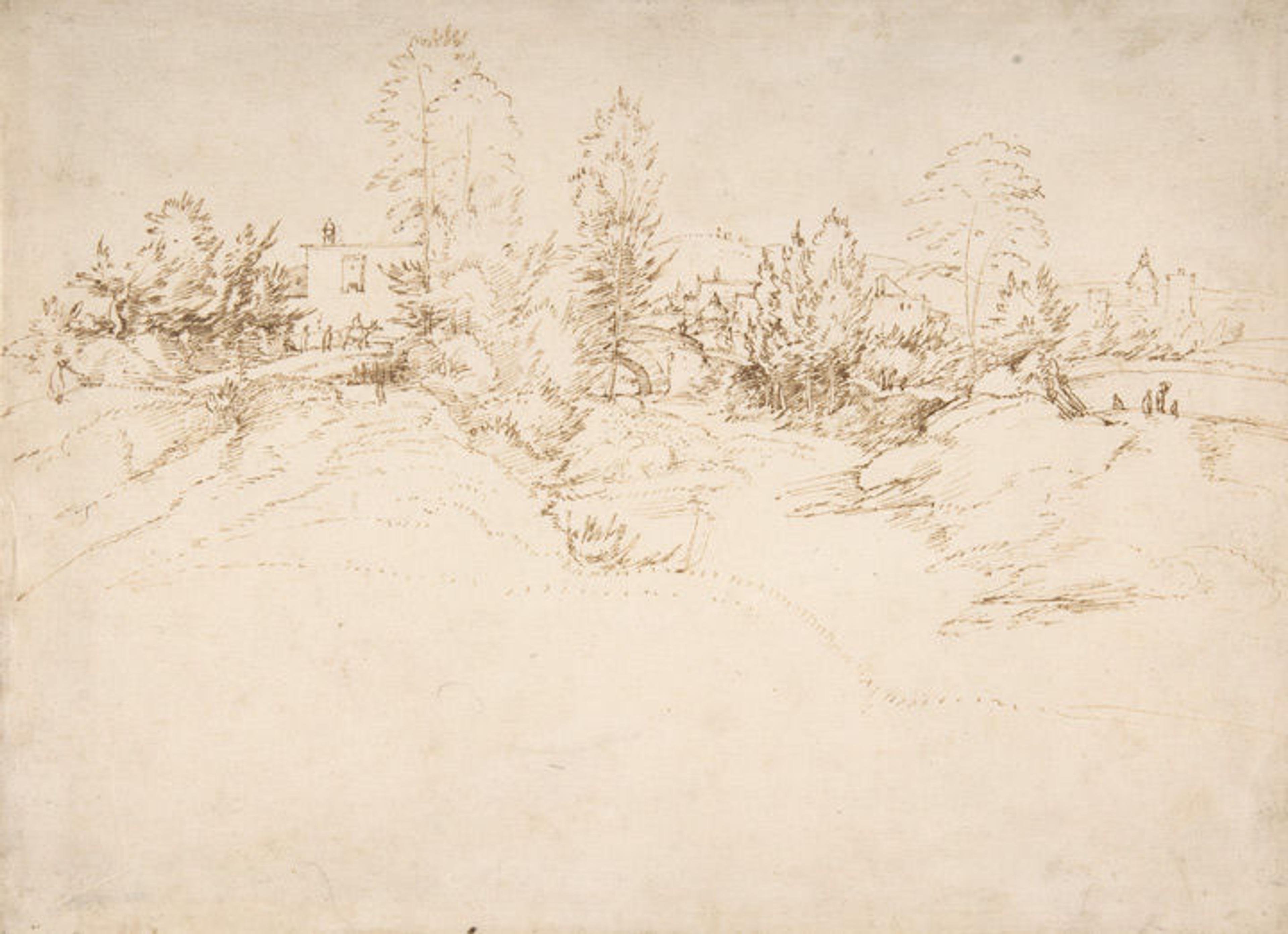 Fig. 3. Fra Bartolomeo (Bartolomeo di Paolo del Fattorino) (Italian, 1473–1517). Landscape (Wooded Approach to a Town), ca. 1508. Pen and brown ink, 8 7/16 x 11 1/2 in. (21.4 x 29.2 cm). The Metropolitan Museum of Art, New York, Bequest of Walter C. Baker, 1971 (1972.118.239)