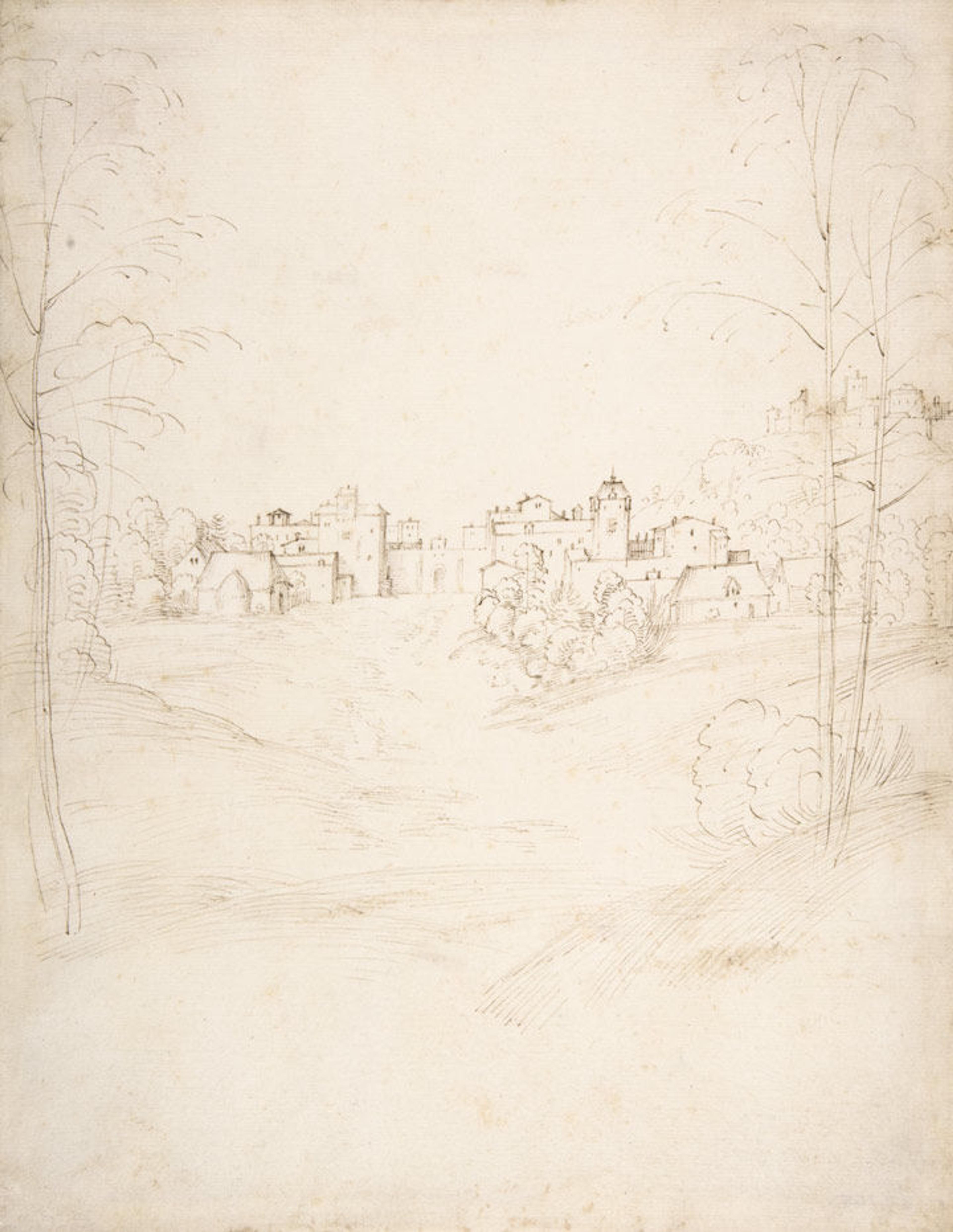 Fig. 4. Fra Bartolomeo (Bartolomeo di Paolo del Fattorino) (Italian, 1473–1517). A Small Town on the Crest of a Slope, ca. 1508. Pen and brown ink, 11 x 8 9/16 in. (27.9 x 21.7 cm). The Metropolitan Museum of Art, New York, Rogers Fund, 1957 (57.165)