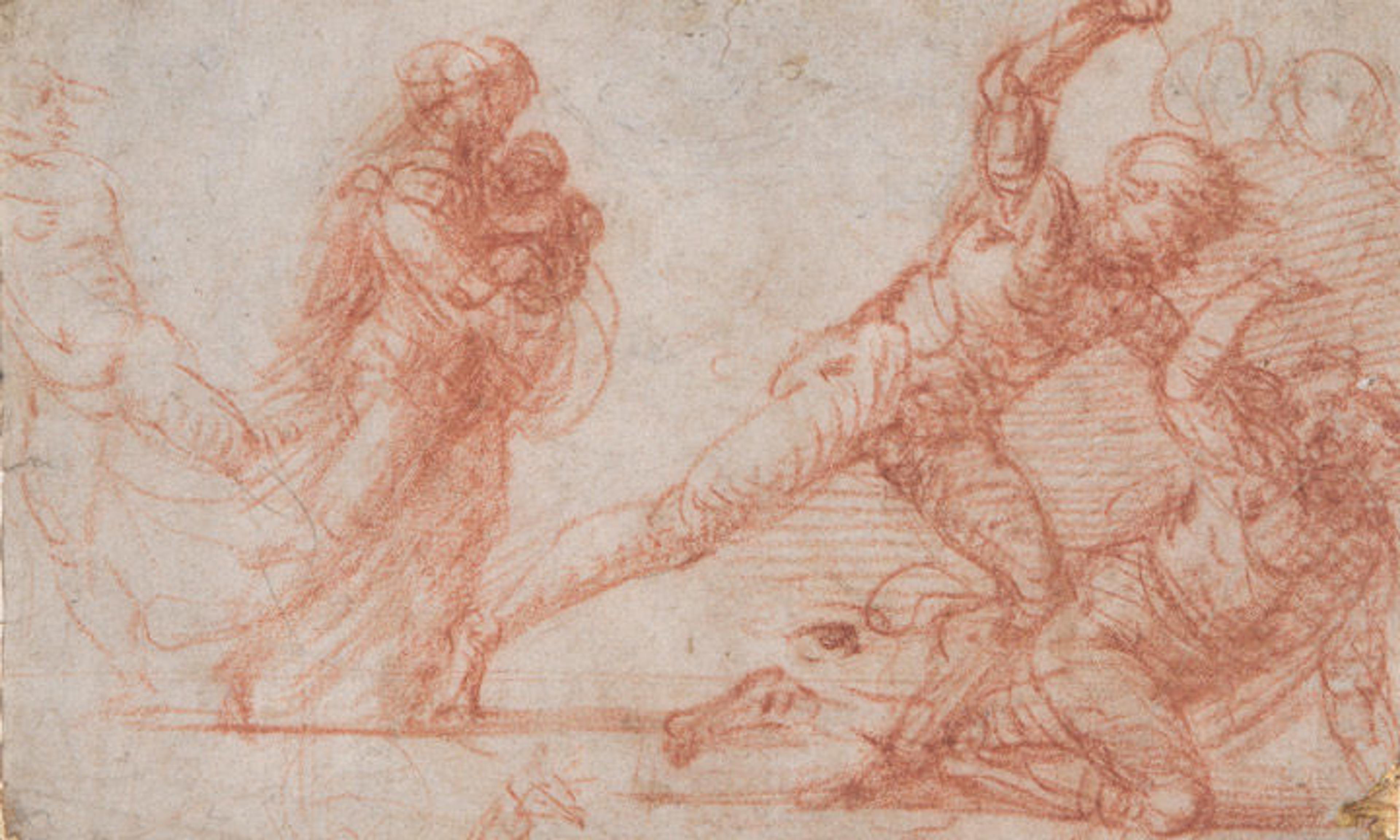 The energetic sketch Fighting Figures was likely realized in preparation for a painting that is now lost, but was still recorded in an early replica made by Fra Bartolomeo's pupil Giuliano Bugiardini (1475–1577) (now in Vienna's Kunsthistorisches Museum). The subject is identified as the Rape of Dinah, described in Genesis (34:1–31). Dinah's brothers, the sons of Jacob, slayed the Hivites as retribution for her rape. Fra Bartolomeo created the dramatic scene—one that was extremely rare in Italian Renaissance art—using only a vibrant red chalk and focusing in particular on the movement of the figures and on their classical proportions.