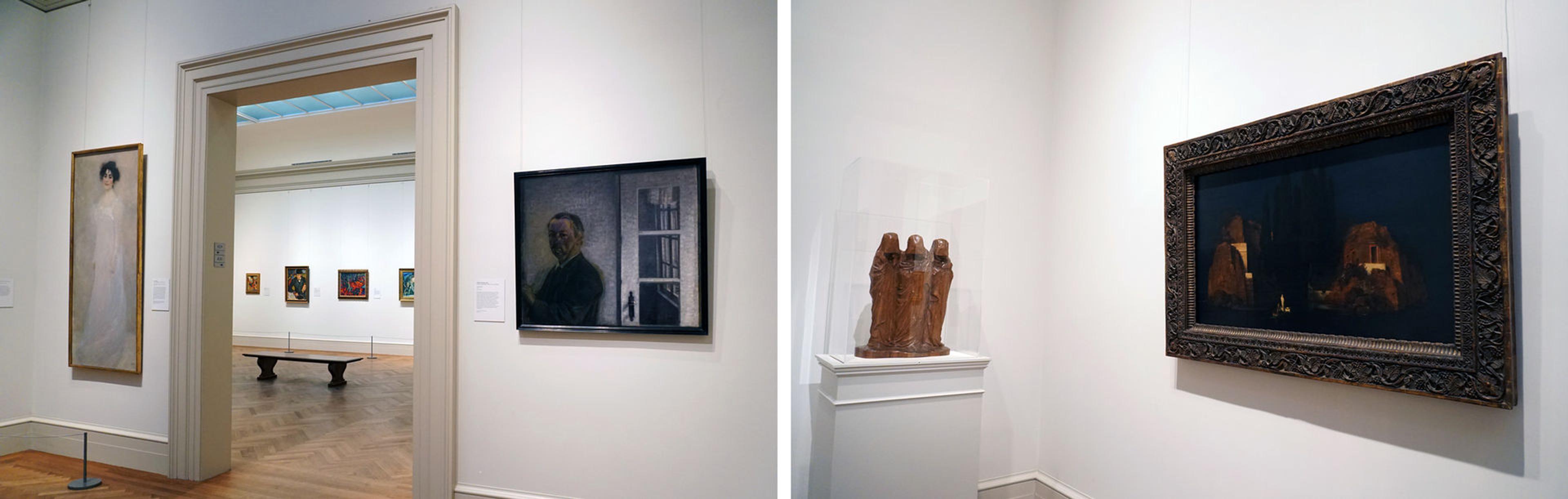 Left: Gustav Klimt's Serena Pulitzer Lederer and Vilhelm Hammershøi's Self-Portrait flank one of the gallery's doorways. Right: George Minne's Three Holy Women at the Tomb complements Arnold Böcklin's Island of the Dead