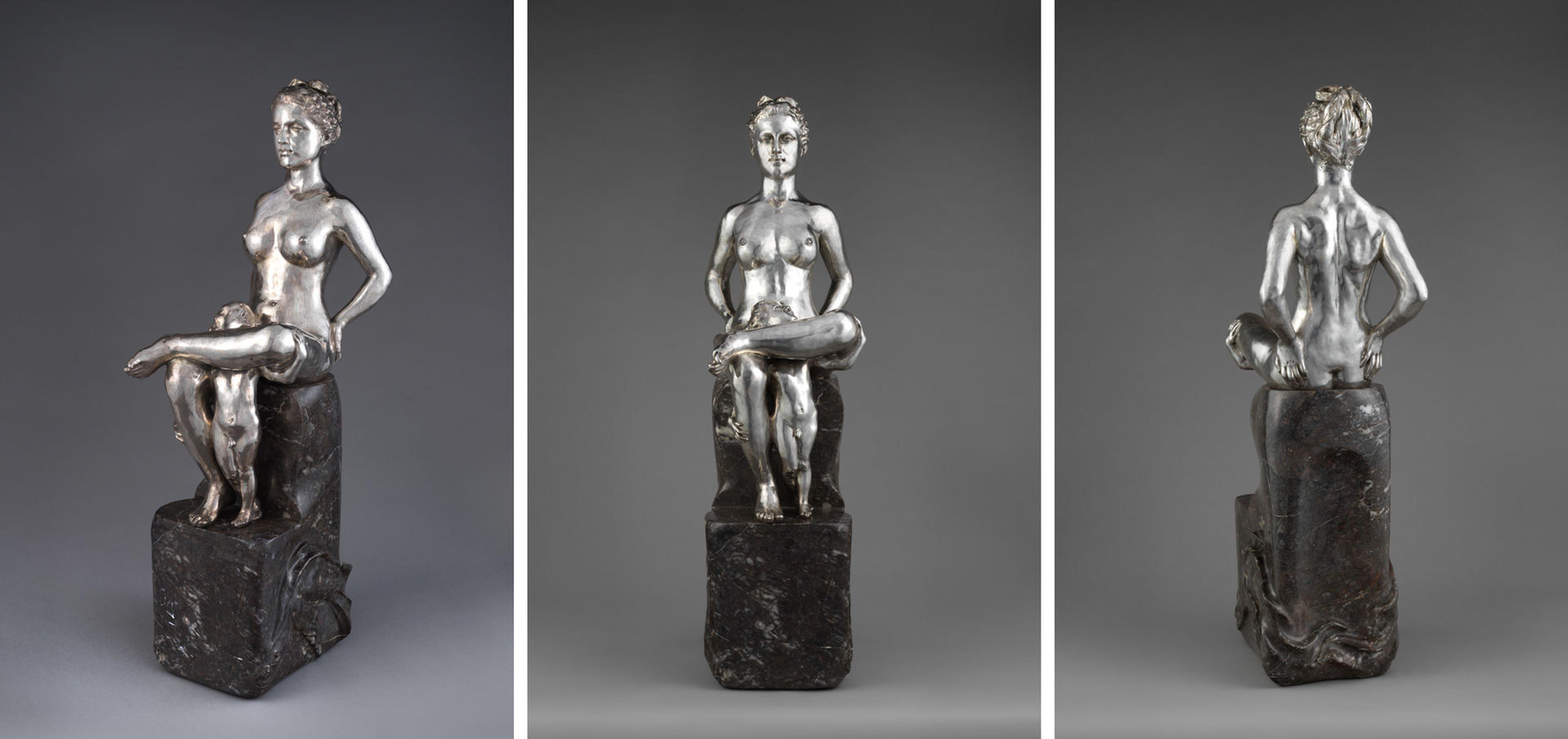 We recently welcomed a major new acquisition in the galleries of nineteenth- and early twentieth-century European paintings and sculpture: a statue of the sea goddess Galatea, made in 1906 by the leading German artist Max Klinger. Acquired by the Department of European Sculpture and Decorative Arts (ESDA), it is a real statement piece: a nearly four-foot-tall woman, accompanied by a young boy, cast in polished silver, and seated on a marble throne. Assertive, beautiful, and gleaming, Galatea represents the archetypal union between body and mind, female and male, sexuality and the psyche. The Department of European Paintings collaborated with ESDA and the Department of Modern and Contemporary Art to install the work in gallery 829, alongside other German and Austrian masterpieces from the turn of the twentieth century.