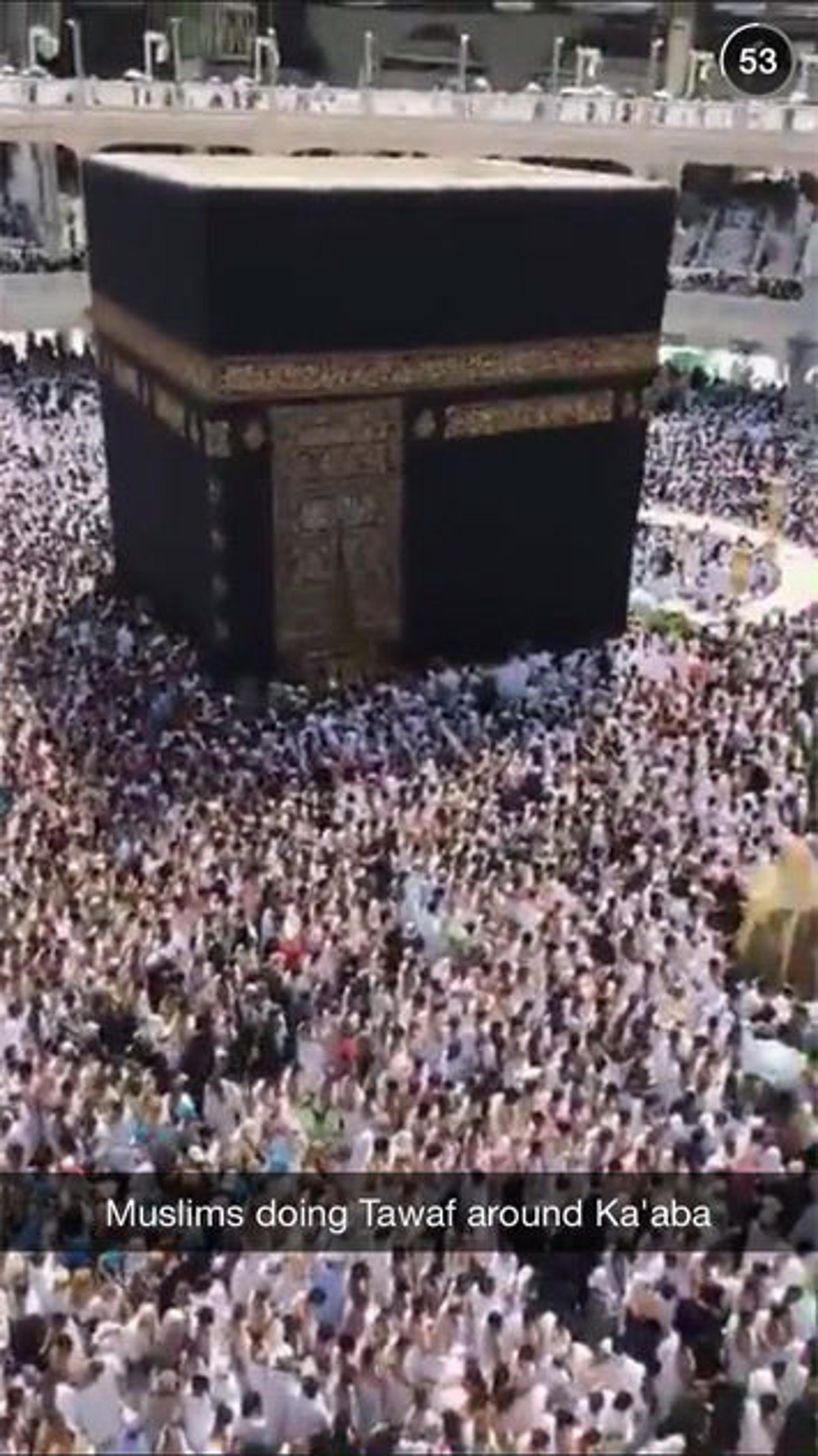 Left: Fig. 9. Muslim pilgrims circle the Ka'aba in Mecca, from Aisha Gani, "Mecca Worshippers Stream Their Stories Live on Snapchat," The Guardian, published July 14, 2015.
