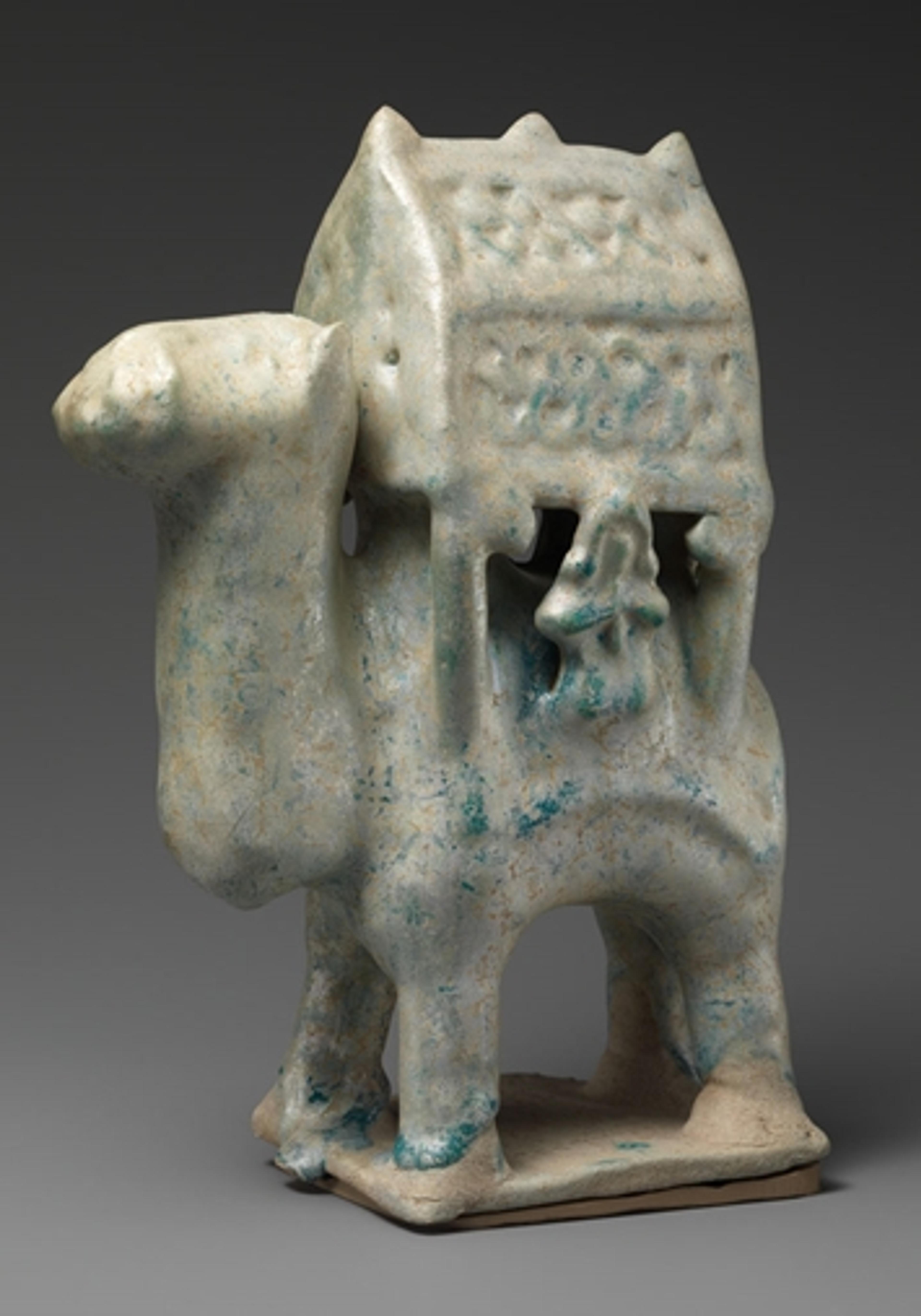 Left: Fig. 3. Turquoise figurine in the form of a camel carrying Palanquin and two riders, 12th–early 13th century. Attributed to probably Iraq or Iran. Islamic. Stonepaste; molded in sections, glazed in turquoise, H. 7 11/16 in. (19.5 cm), W. 5 9/16 in. (14.1 cm), D. 2 9/16 in. (6.5 cm). The Metropolitan Museum of Art, New York, Fletcher Fund 1964 (64.59)