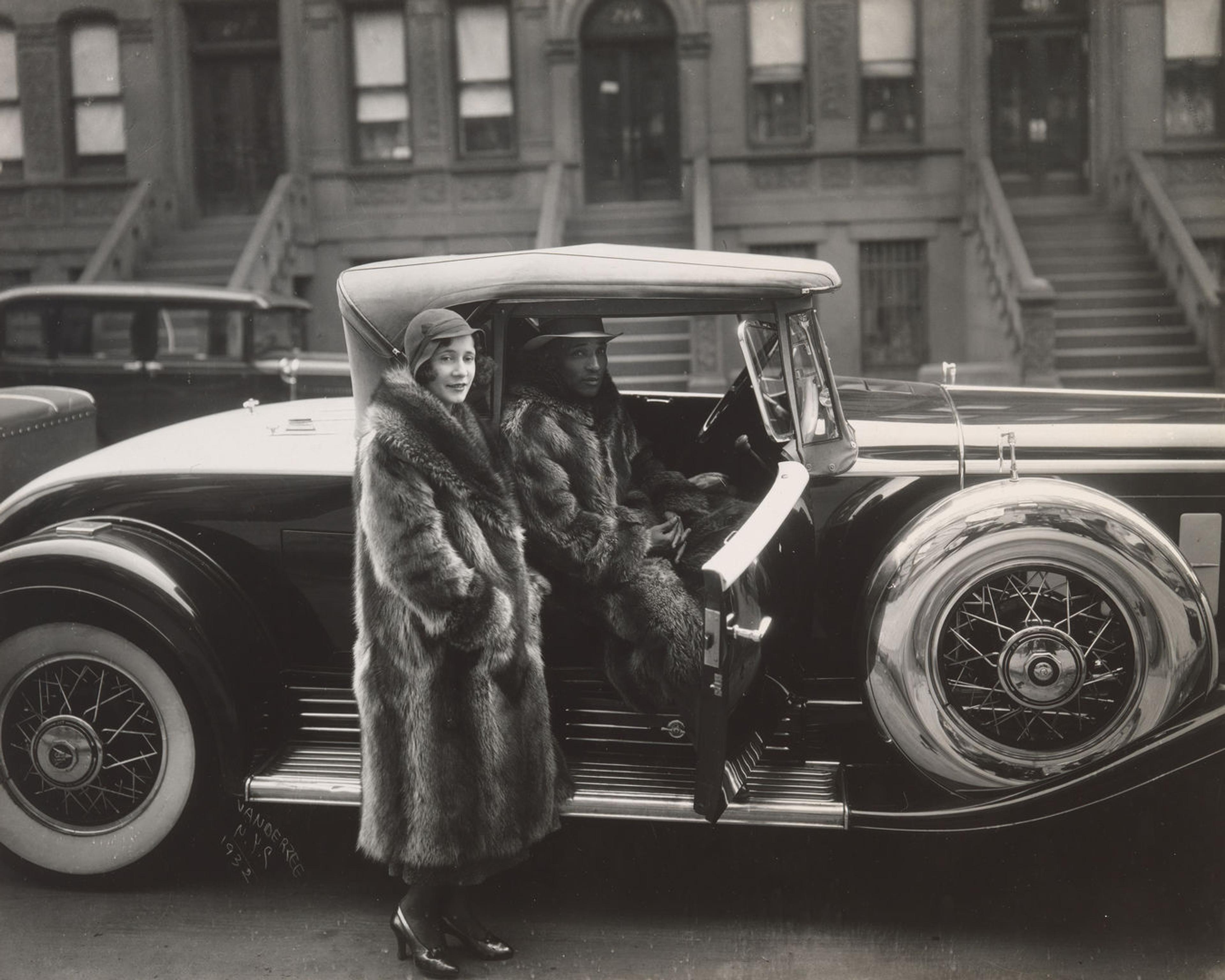 COOKS: Everything about this photograph is impressive. From the background brownstones that we can see in the recess of the photograph to the cars in the photograph, particularly this very fancy Cadillac that takes up most of the picture. And we have this gorgeous couple. The man who’s in the car wearing this full-length raccoon coat, and the woman who’s standing elegantly. I mean, it may have been posed, but it may have just been a really opportunistic photograph of seeing these two people and being so inspired by the way that they look that James Van Der Zee stopped to take their picture.