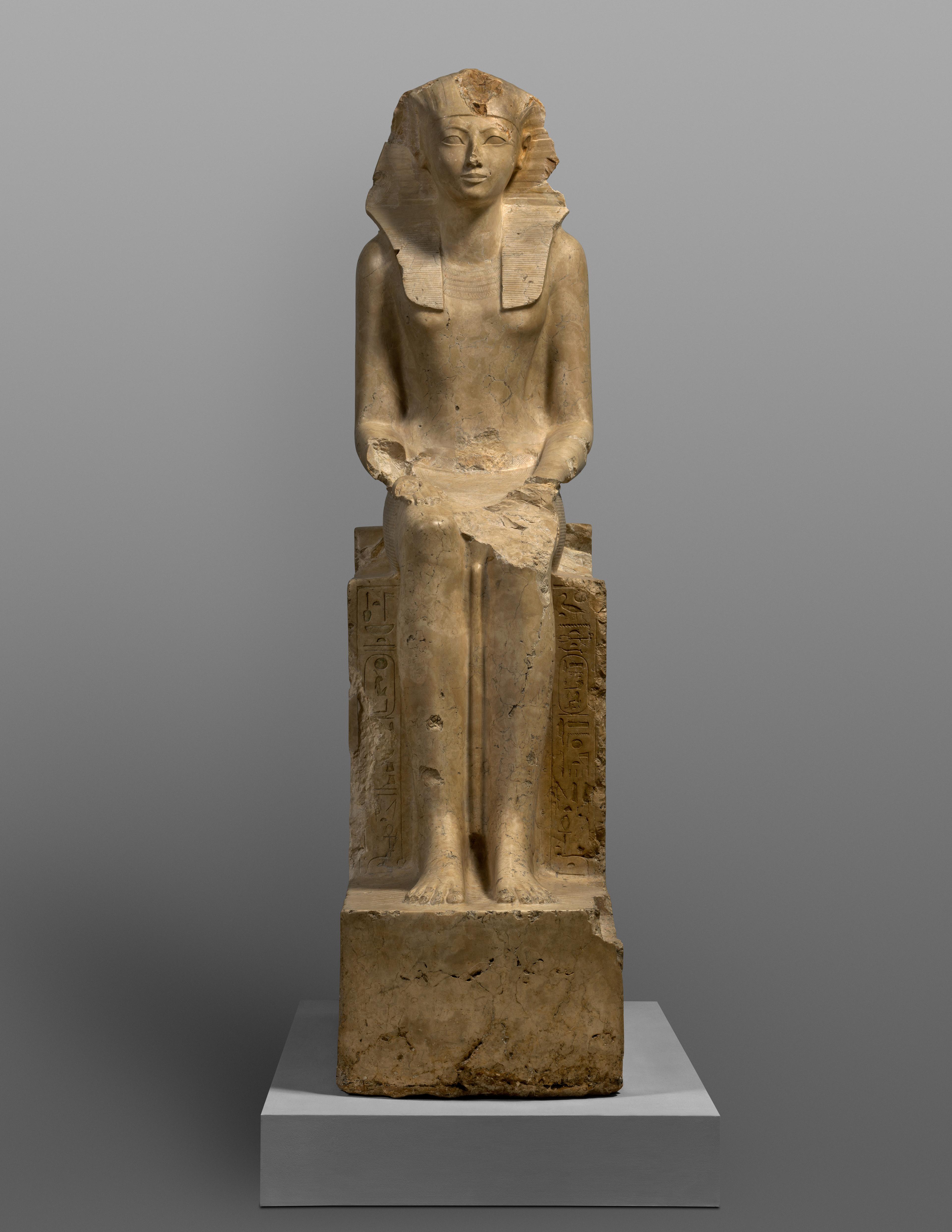 Seated Statue of Hatshepsut. Indurated limestone, paint. New Kingdom, Dynasty 12, Joint reign of Hatshepsut and Thutmose III (ca. 1479–1458 BCE). From Egypt, Upper Egypt, Thebes, Deir el-Bahri & el- Asasif, Senenmut Quarry, MMA excavations, 1926–28/Lepsius 1843–45. The Metropolitan Museum of Art, New York, Rogers Fund, 1929 (29.3.2)