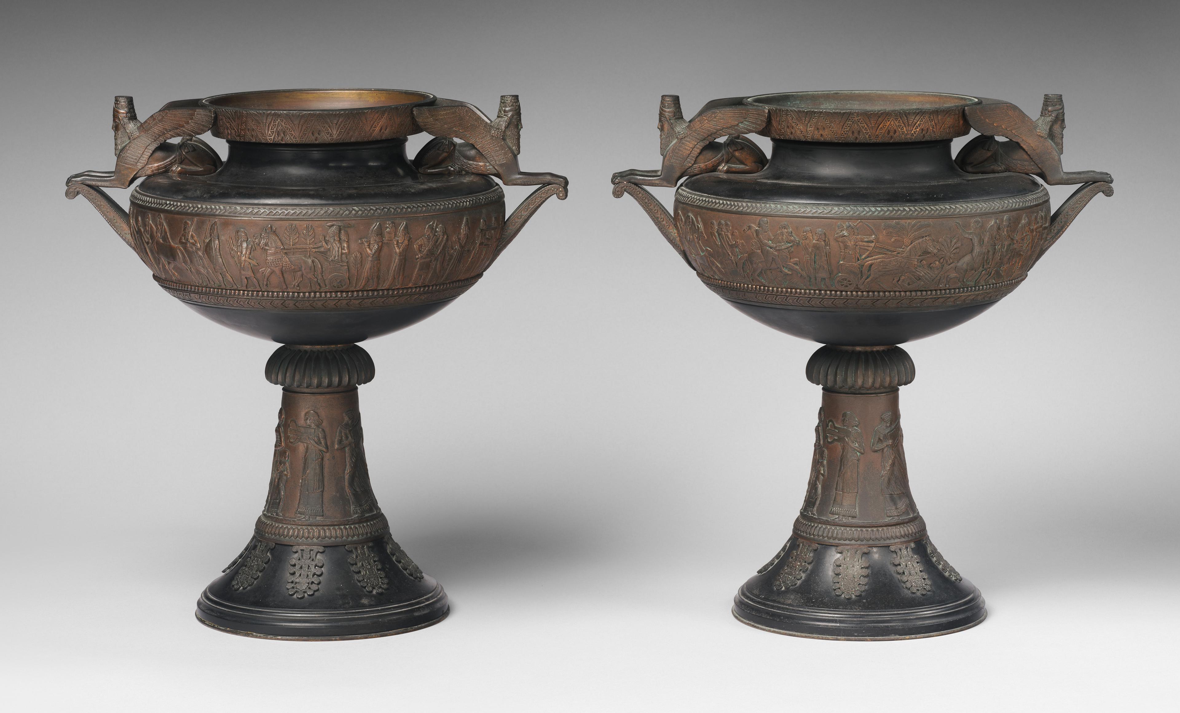 Urn with Assyrian scenes, 1851. French. Victorian. Slate, bronze, 15 3/4 in. x 15 in. (40 x 38 cm). The Metropolitan Museum of Art, New York, Henrietta and Christopher McCall Collection, Purchase, Bequest of Henrie Jo Barth, and Museum Acquisitions and Josephine Lois Berger-Nadler Endowment Funds, 2023 (2023.650 and 2023.651)