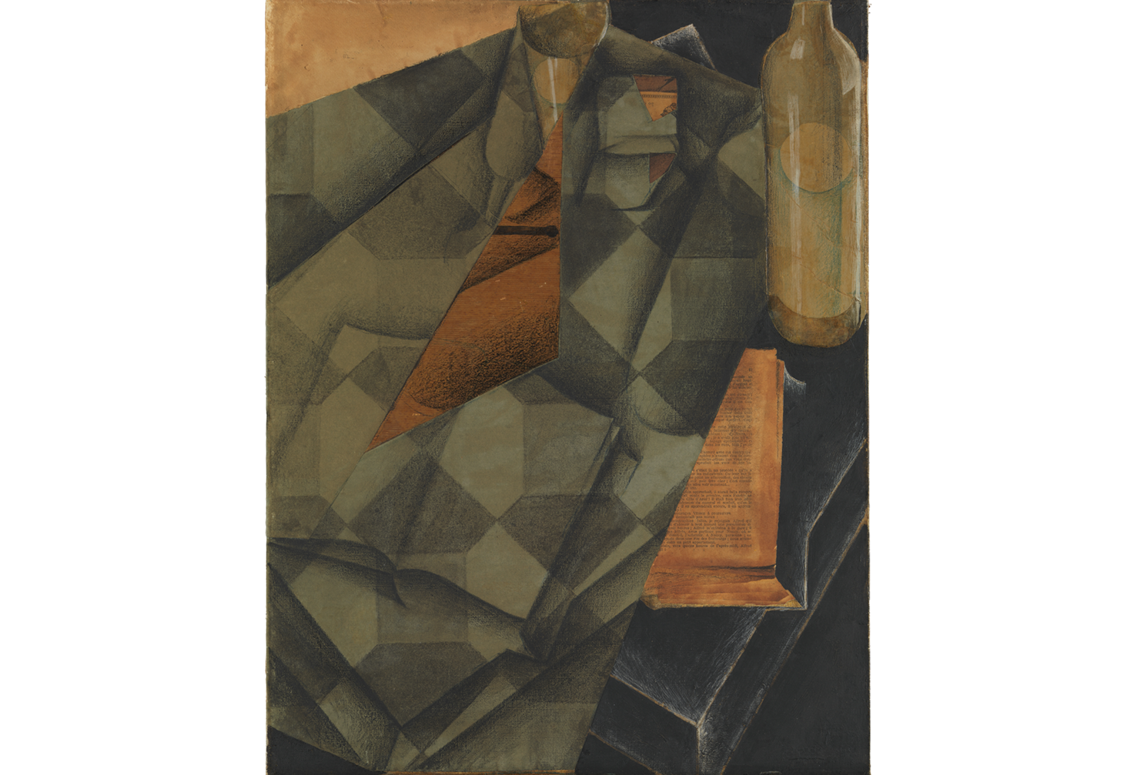 Juan Gris (1887–1927), Book and Glass, 1914. Conté crayon, charcoal, wax crayon, watercolor, gouache, oil, cut-and-pasted printed and selectively varnished wallpaper, blue and white laid papers, transparentized paper, and printed white wove papers; adhered overall onto a sheet of torn newspaper, adhered to primed canvas; subsequently mounted to a honeycomb panel, 25 11/16 x 19 13/16 in. (65.2 x 50.3 cm). Promised Gift from the Leonard A. Lauder Cubist Collection