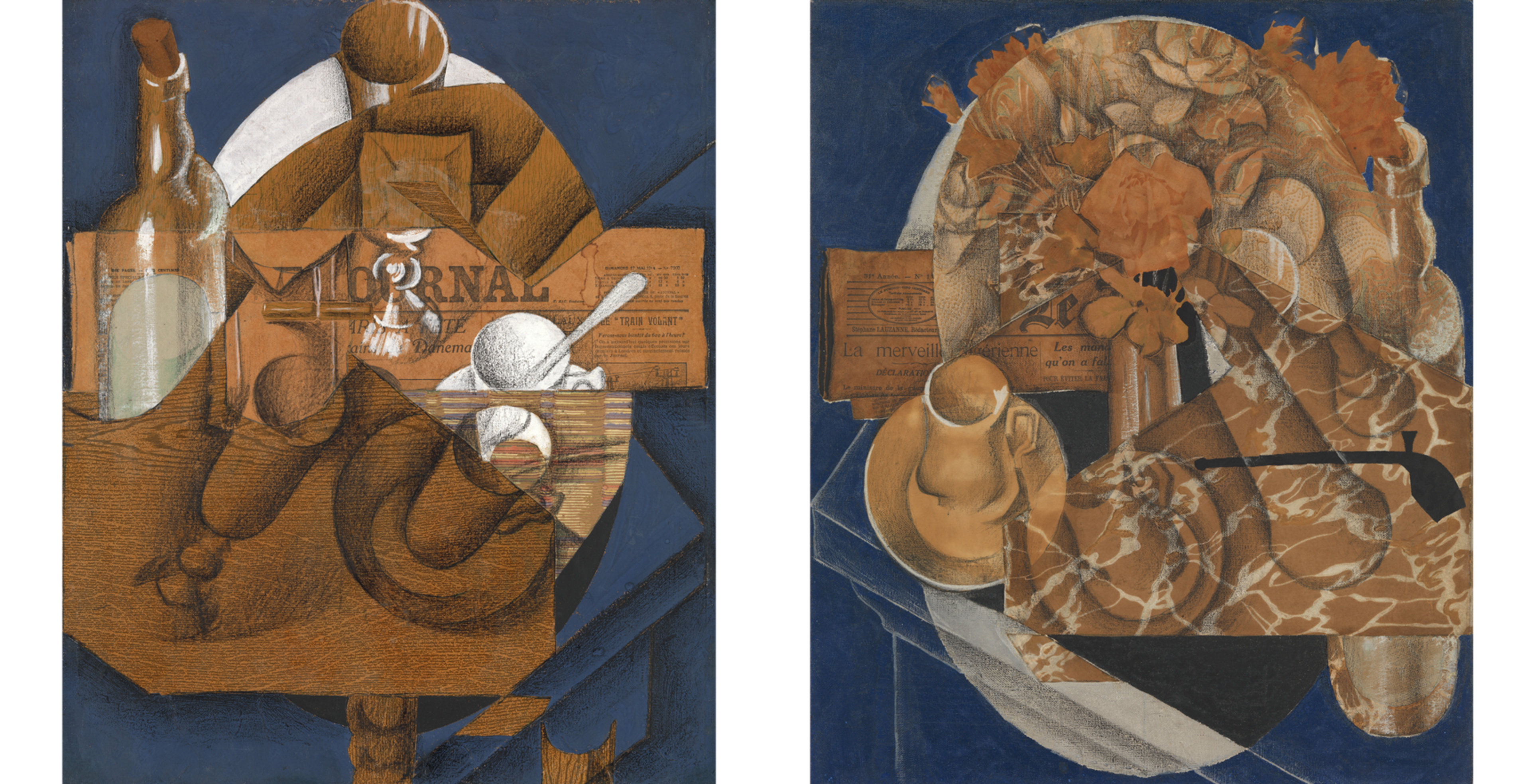 To the untrained eye, two collages by Juan Gris in the Leonard A. Lauder Cubist Collection—Cup, Glasses, and Bottle (Le Journal) and Flowers—appear to have similar painted blue backgrounds. In fact, Gris used different materials for each.