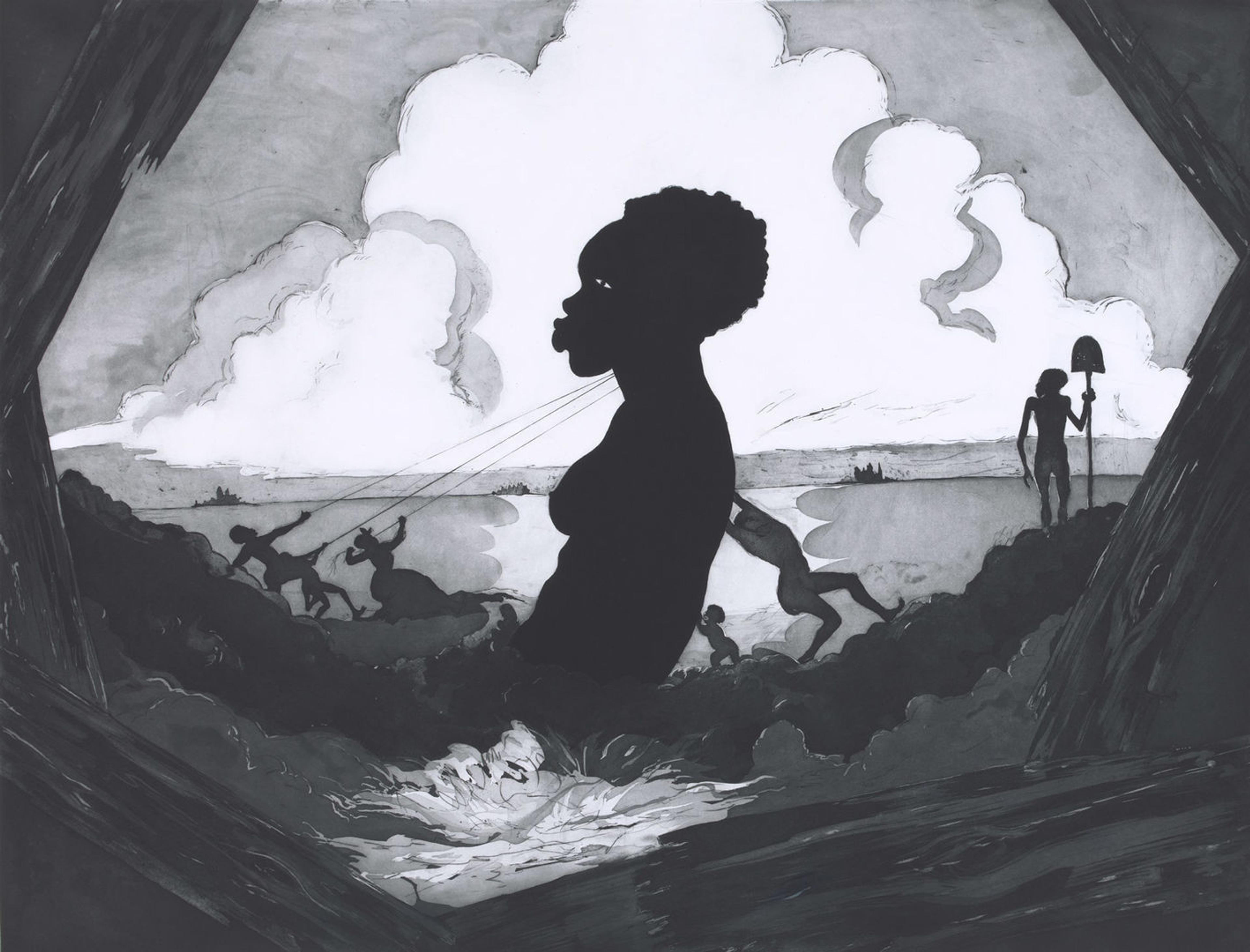 In this triptych, which in form and imagery evokes the altarpiece tradition, Walker imagines a possible memorialization of the African American experience in regards to slavery and the Middle Passage. Dominating the work's central panel is a massive sculpture of the torso of a naked Black woman being raised by several Black men, women, and children of various ages depicted in smaller scale on a rocky shore against the backdrop of a pyramid of white clouds. The ropes the figures pull to elevate the sculpture evoke the violence of slavery and lynching and its commemoration in art, while the shovel held by a male figure on the right resembles a scepter.