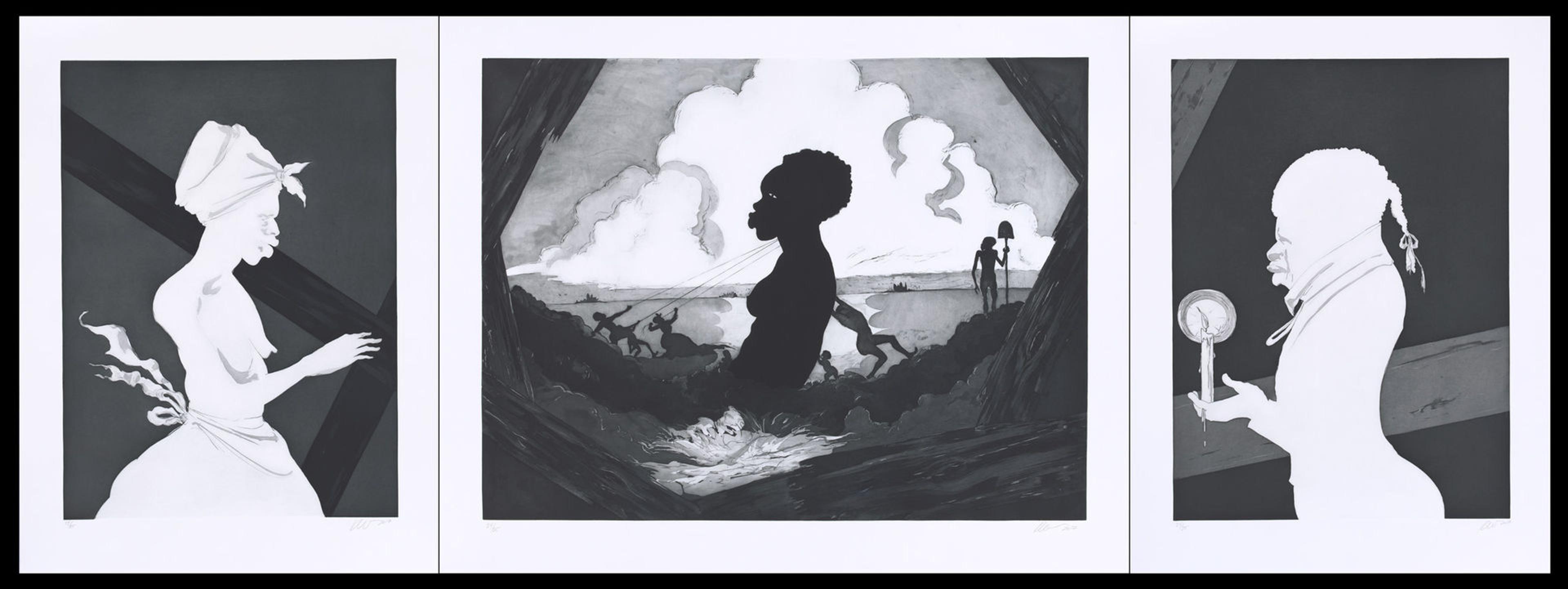 Kara Walker (American, born 1969). Printer: Gregory Burnet. Resurrection Story with Patrons, 2017. Etching with aquatint, sugar-lift, spit-bite and dry-point, Printed on Hahnemuhle Copperplate Bright White 400gsm paper, 39.75 x 30 inches (101 x 76.2 cm); 39.75 x 49 inches (101 x 124.5 cm); 39.75 x 30 inches (101 x 76.2 cm). The Metropolitan Museum of Art, New York, Purchase, John B. Turner Fund, 2018 (2018.120a–c). © Kara Walker