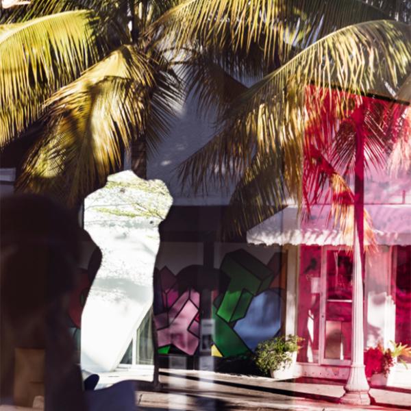 Anastasia Samoylova’s images capture the trompe l’oeil of Florida, many to do with water and glass—the mise-en-abyme of cypress trunks reflected in a tannic creek, the indoor pool of a flooded ground floor, the inverted rubric of a passing flamingo in a pond. Venus Mirror, Miami (2020)—a definitive statement of Floridian aesthetics—was photographed through the highly reflective plate glass of a shop window. It flattens a three-dimensional space into a collage of palm frond and pilaster, mannequin and mural, awning and wave, inside and outside, reflection and shadow.