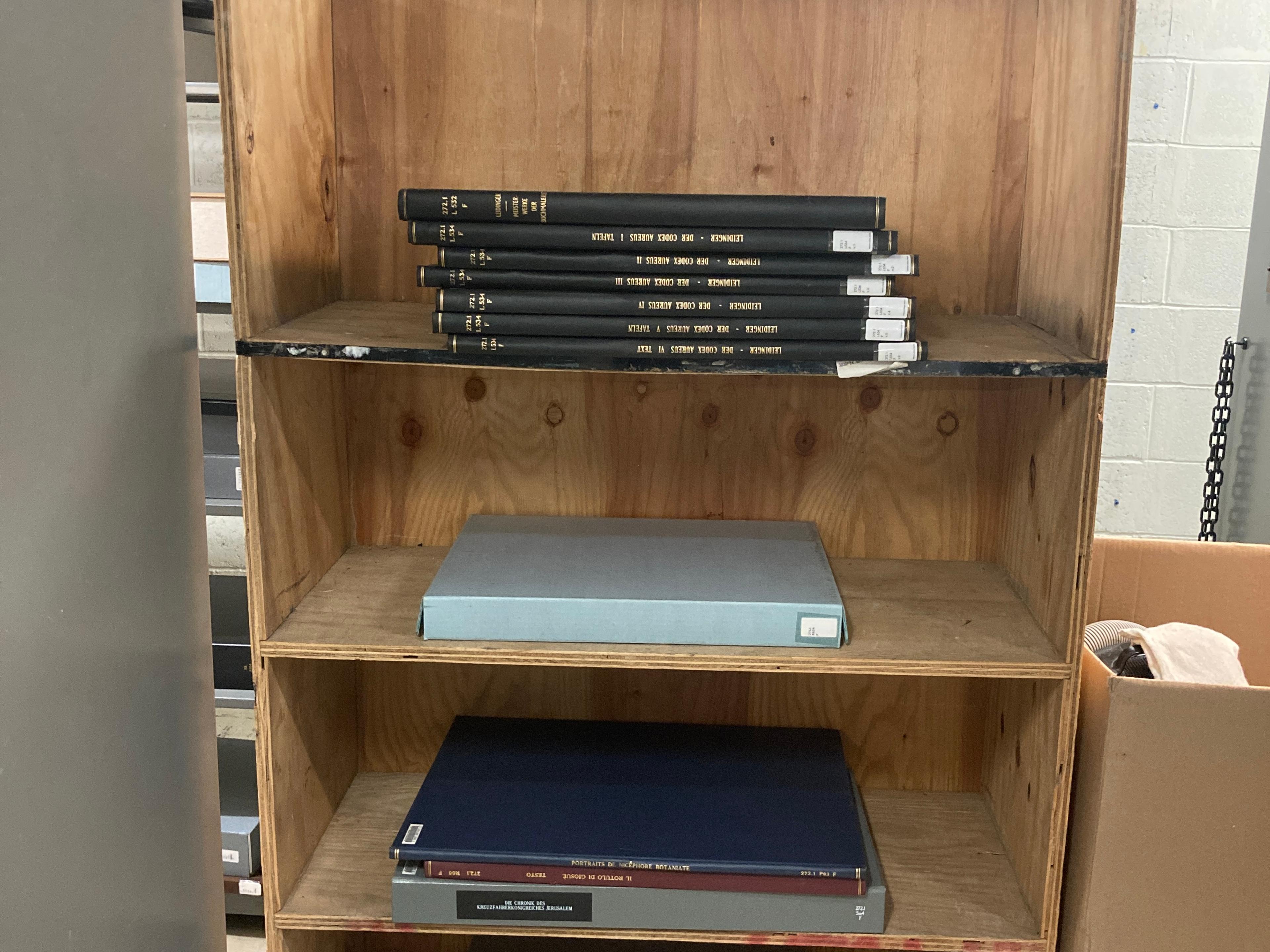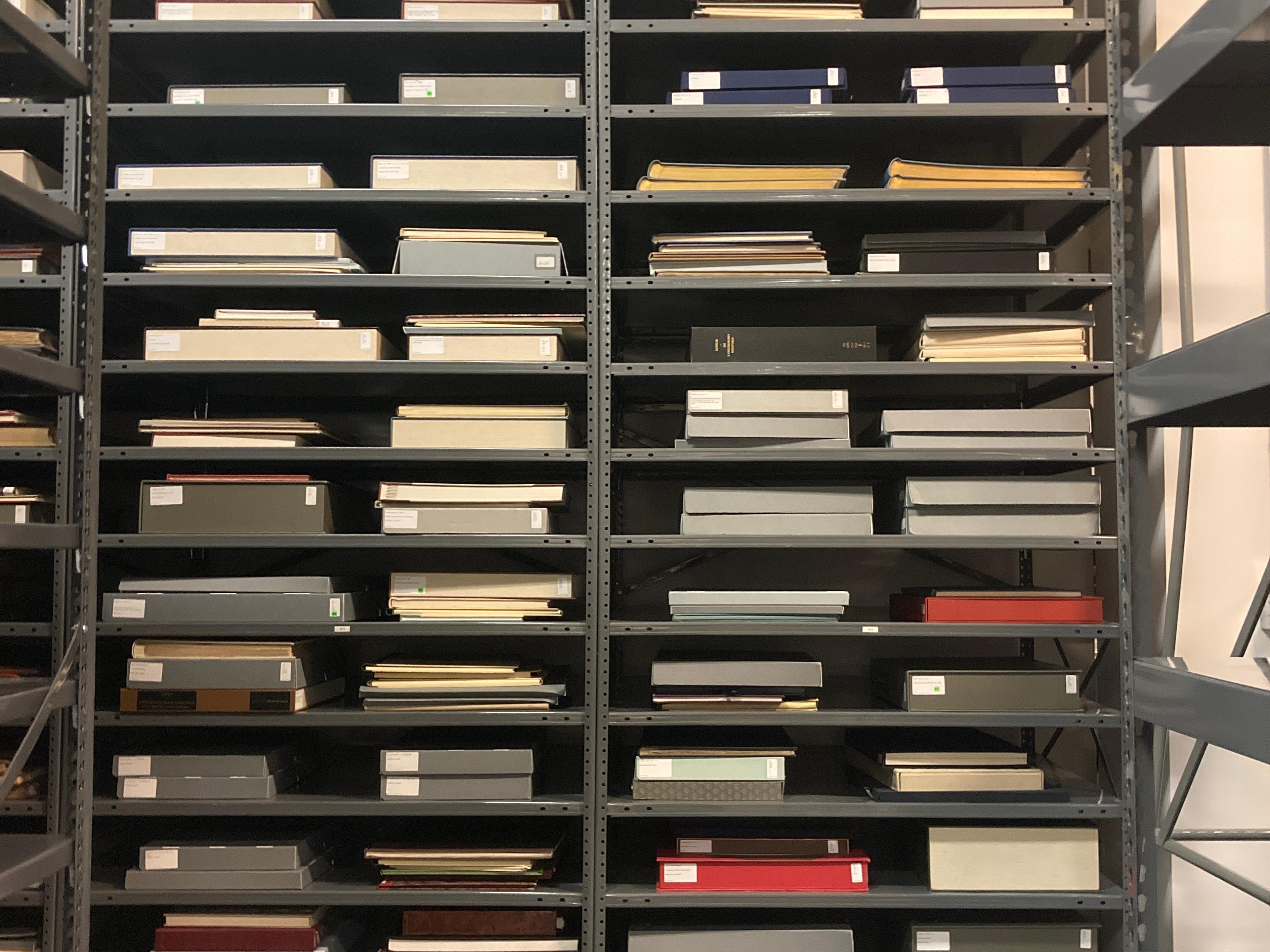 In the photos above, you can see that many of these folios have been put in custom enclosures by Watson’s Book Conservation unit, many over the past year in preparation for this move. This enabled them to be moved and re-stacked safely.