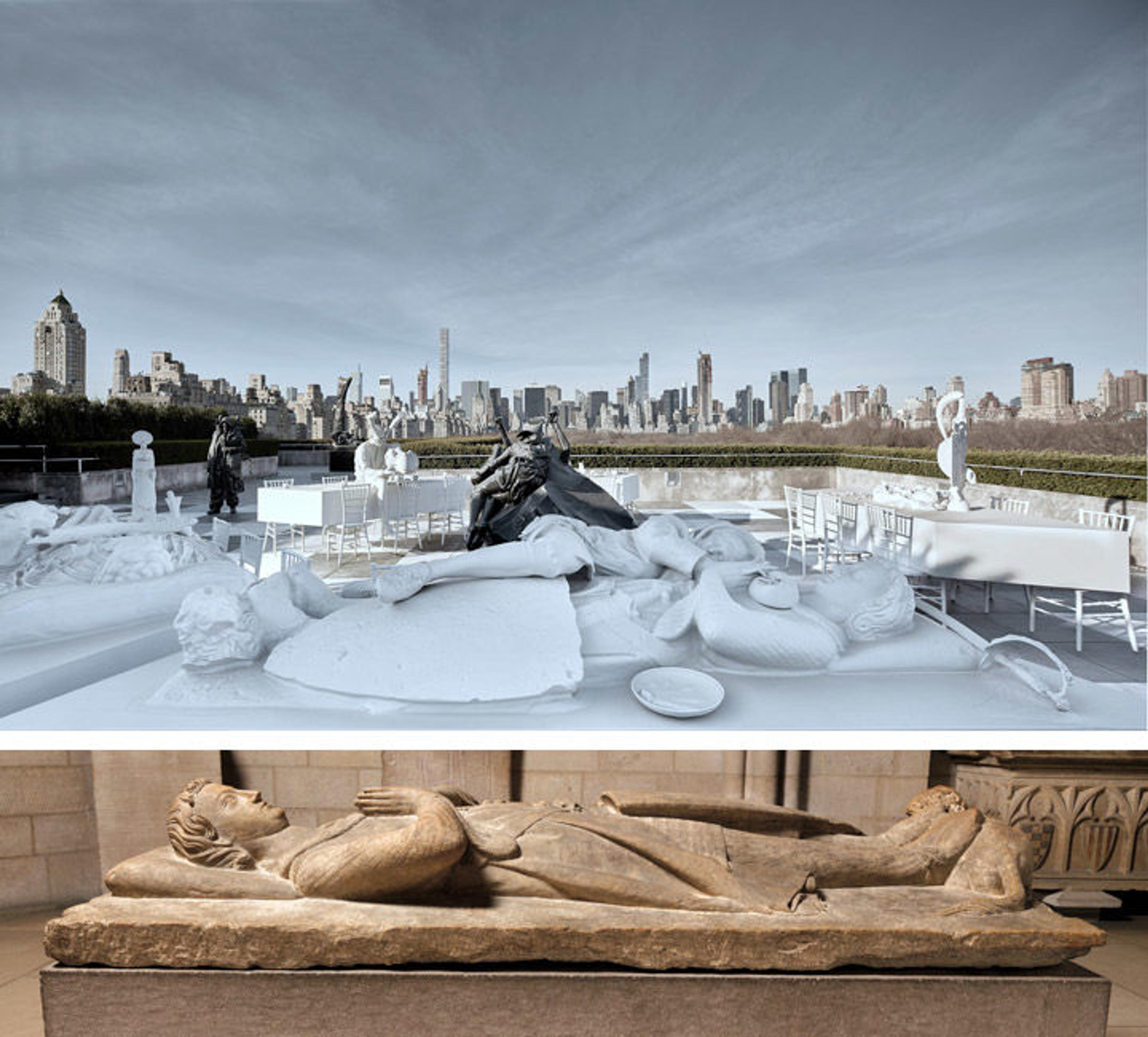 Top: View of The Theater of Disappearance. Bottom: A knight of the d'Aluye family, after 1248–by 1267. French. Limestone, 13 x 33 1/2 x 83 1/2 in., 1,197 lb. (33 x 85.1 x 212.1 cm, 543 kg). The Metropolitan Museum of Art, New York, The Cloisters Collection, 1925 (25.120.201)
