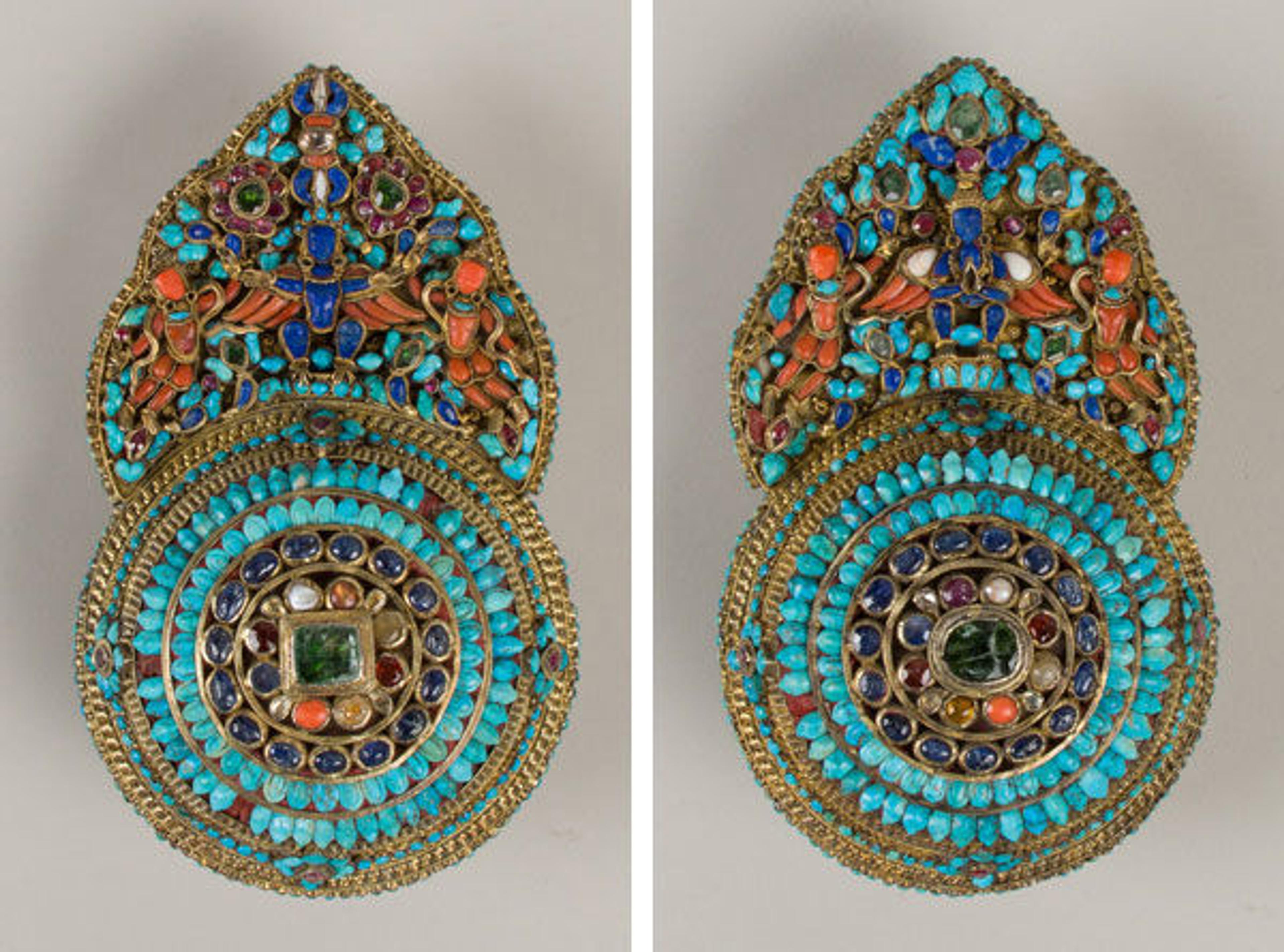 Crown ornaments for a deity, 17th–19th century. Newari for Tibetan Market. Gilt silver, emeralds, sapphires, rubies, garnets, pearls, lapis lazuli, coral, shell, and turquoise; each 6 3/4 x 4 in. (17.1 x 10.2 cm). The Metropolitan Museum of Art, New York, John Stewart Kennedy Fund, 1915 (15.95.81, .82)