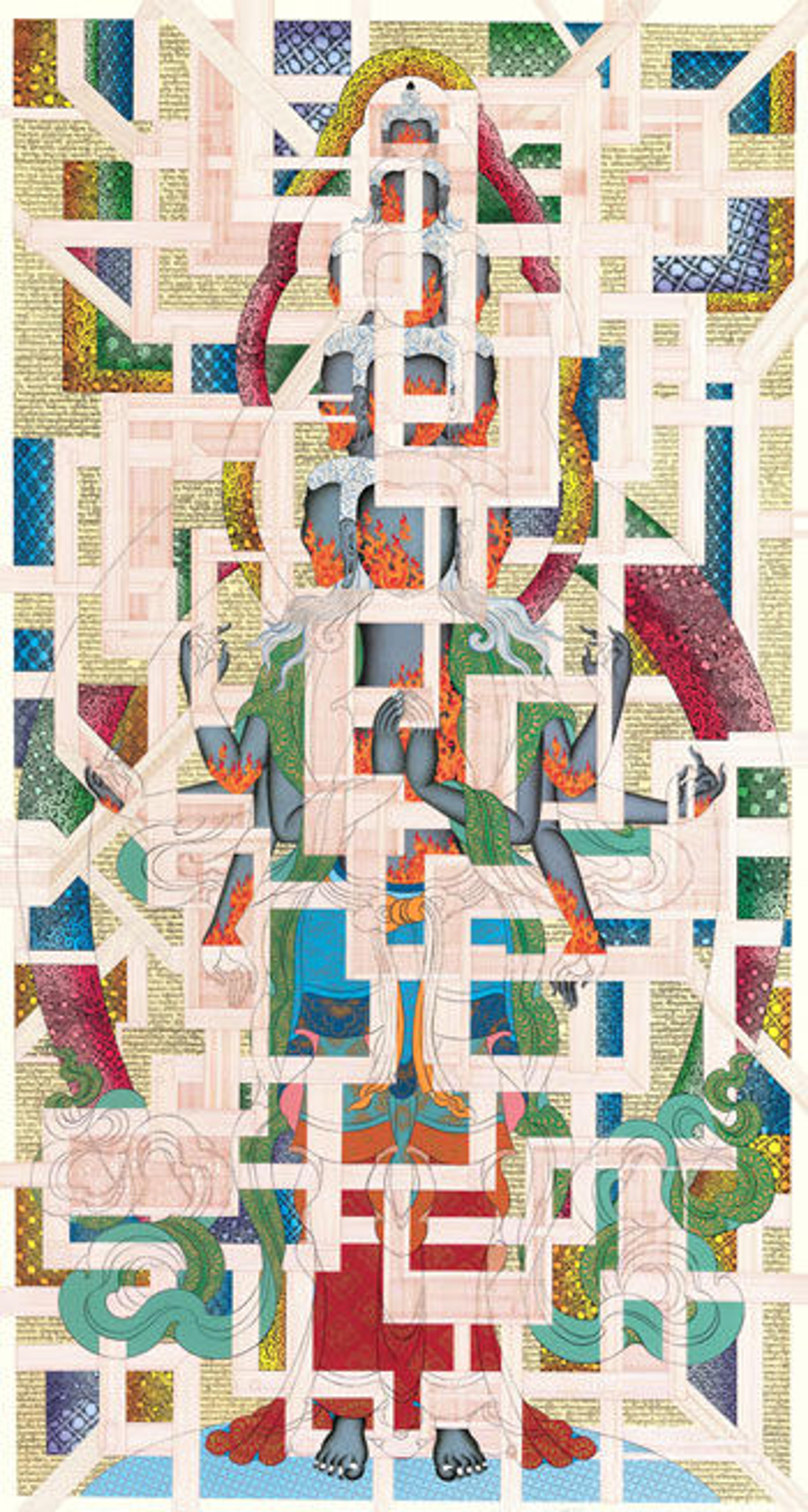 Left: Tenzing Rigdol (born Kathmandu, 1982). Pin Drop Silence: Eleven-Headed Avalokitesvara, 2013. Tibet. Ink, pencil, acrylic, and pastel on paper; Image: 91 5/8 x 49 1/8 in. (232.7 x 124.8 cm). The Metropolitan Museum of Art, New York, Gift of Andrew Cohen, in honor of Tenzing Rigdol and Fabio Rossi, 2013 (2013.627) © Tenzing Rigdol