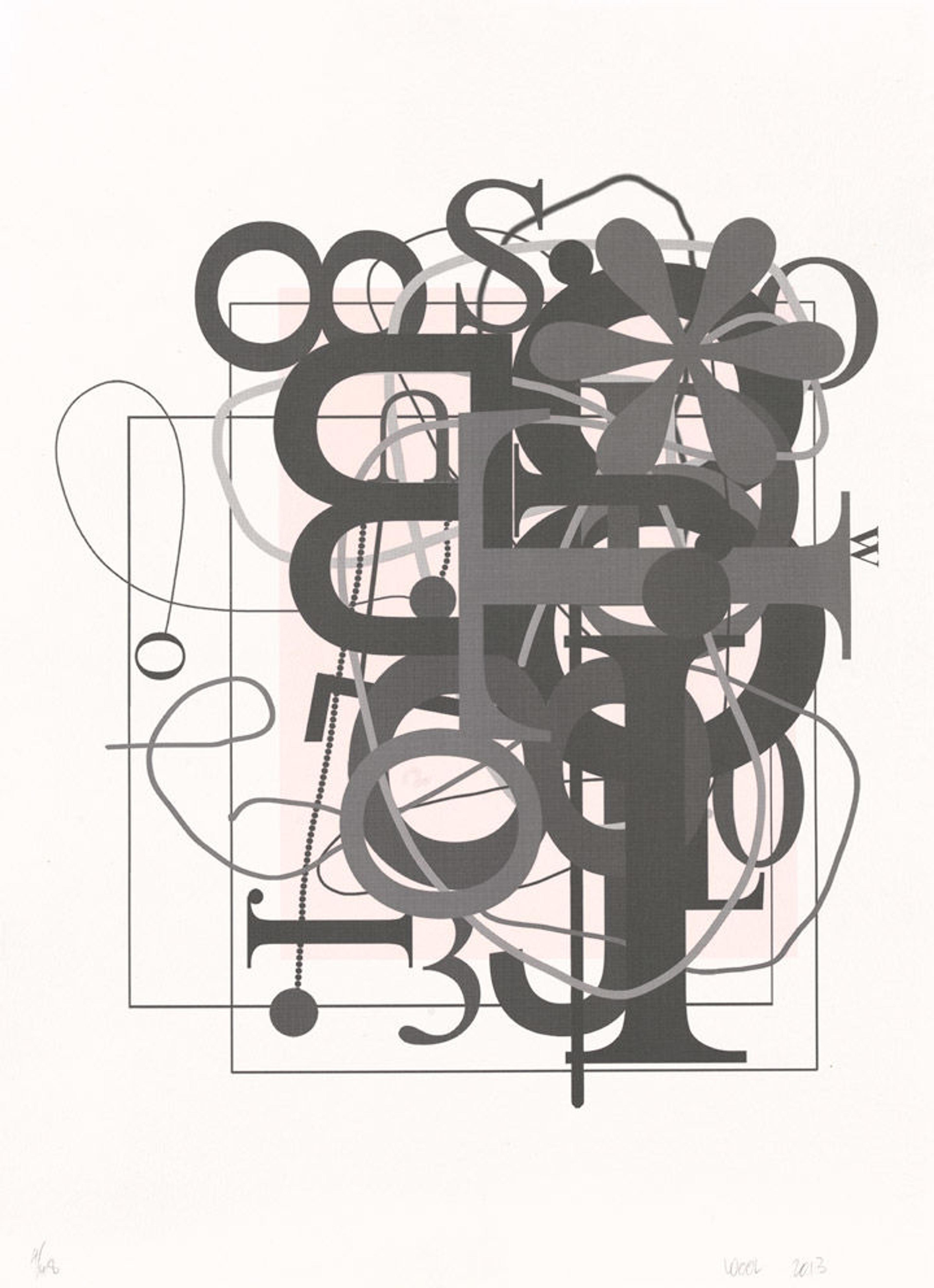 Rendered in gray tones against a background of muted pink and white, the letters vary in size, font, and orientation. Their gracefully curved forms frequently become entangled with one another as well as with the blurred gray skeins strung across the image's surface. The decorative elements, such as floral forms and beaded lines, create a sense of levity interspersed across the composition. As opposed to the structure of Wool's "word paintings," which evoke the grid-like orientation of Gray Alphabets, the collage-like aesthetic, shifting planes, and layers of color and forms in Untitled introduce a dynamic tension that reverberates throughout the composition.