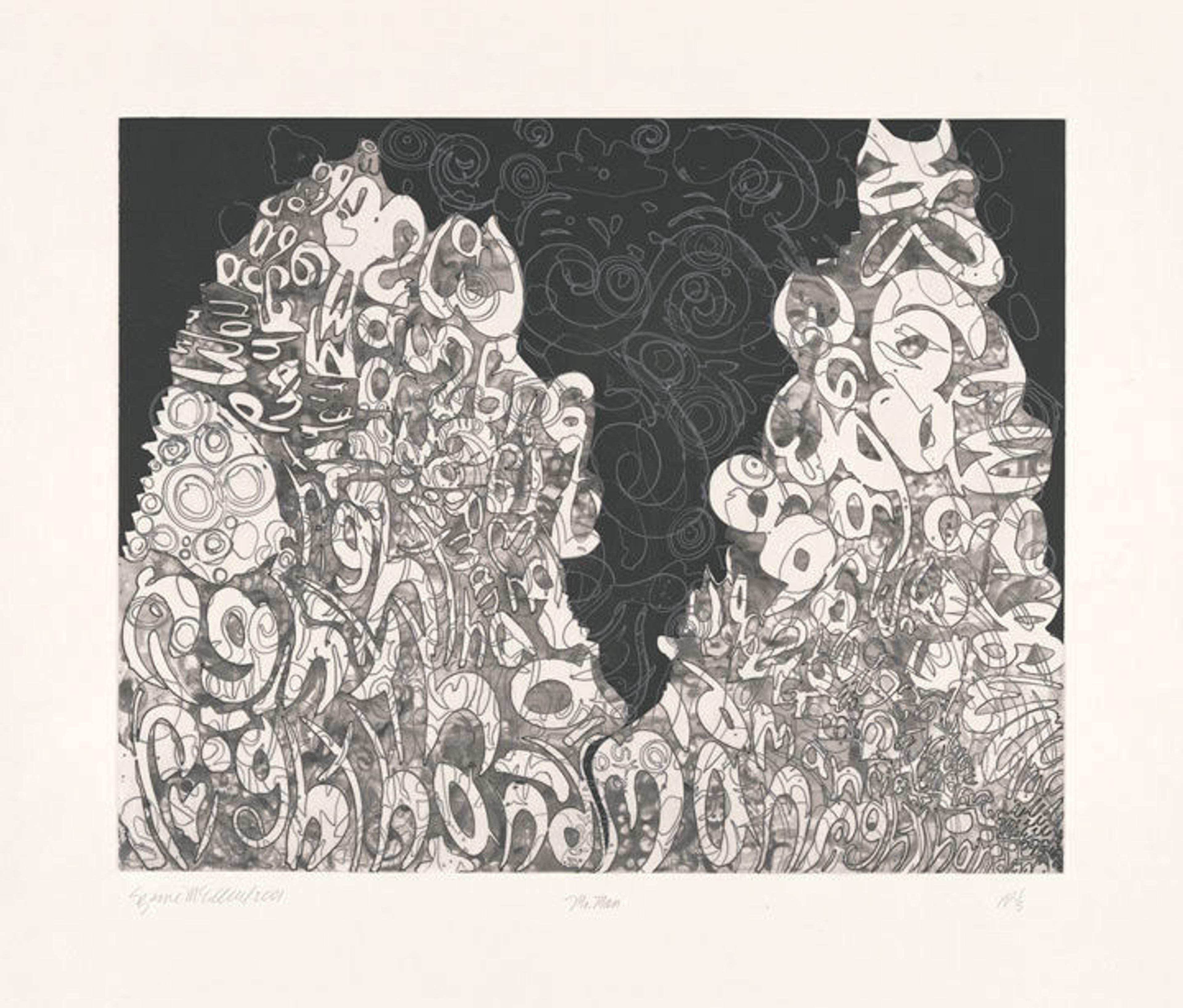 Like Johns, Christopher Wool has examined the relationship, and subsequent tensions, between text and image and between reading and seeing. The large black, stenciled letters of his "word paintings," which contain either single or multiple words decontextualized and without punctuation, possess a graphic power and strangeness that is amplified by their stark white background. In this untitled print, however, Wool focuses on the forms of letters themselves, liberated from linguistic responsibilities.