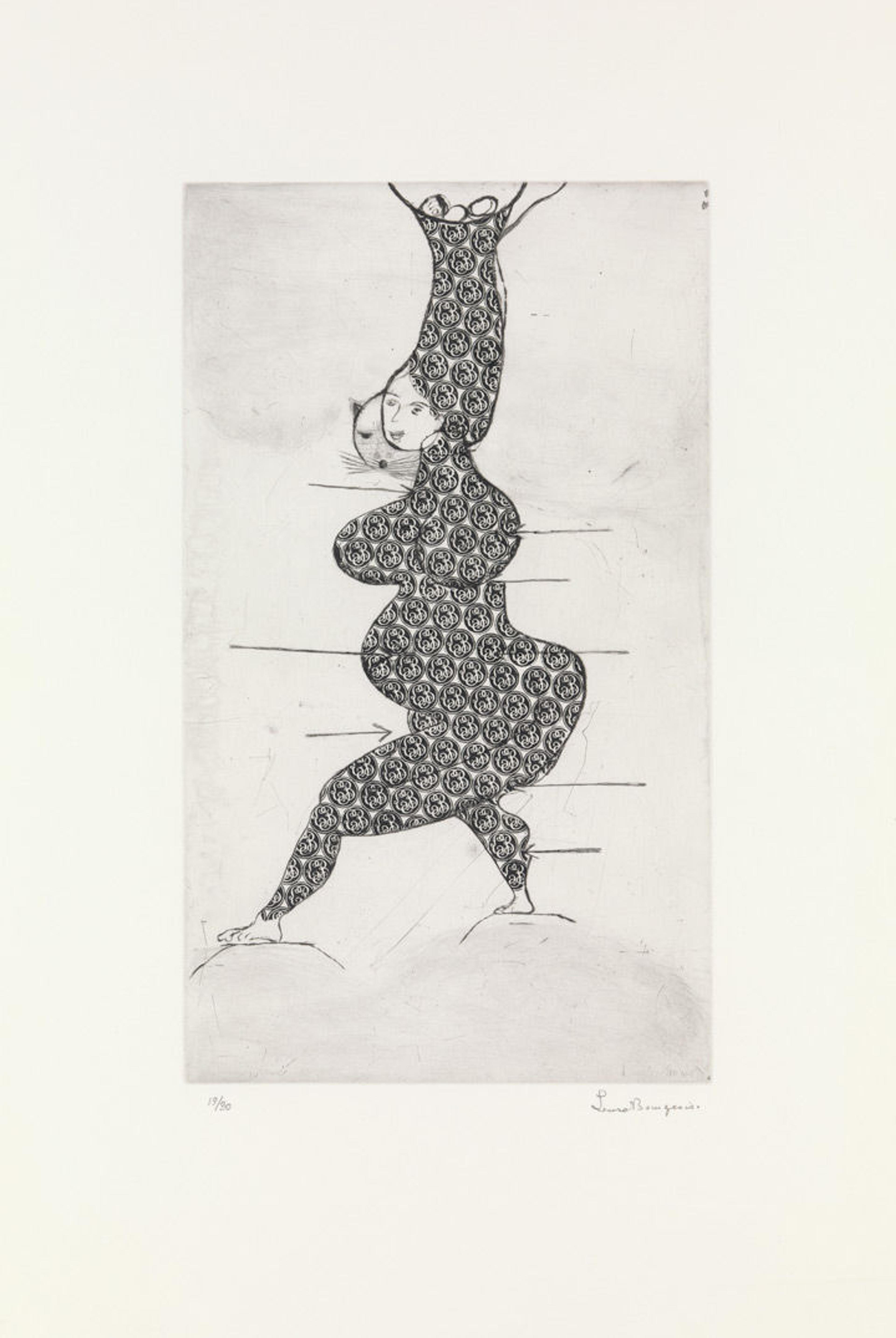 In Stamp of Memories I, which derives from her 1990 print Ste Sebastienne, Louise Bourgeois drew a mythical female version of the martyred saint running naked and smiling despite the arrows that puncture her body. As the print progressed, Bourgeois added a menacing cat's face and three eggs, perhaps alluding to her three sons, and covered the figure's body with circular stamping. Acting as a kind of skin or protective armor, the stamp contains the interlocking forms of "LB." Although the letters corresponds to the artist's initials, the stamp actually belonged to her father, Louis Bourgeois. Bourgeois rejected it and all it symbolized, and, in 1994, she produced Stamp of Memories II, where the less ornate and more easily read block letters of her own stamp cover the figure's body.