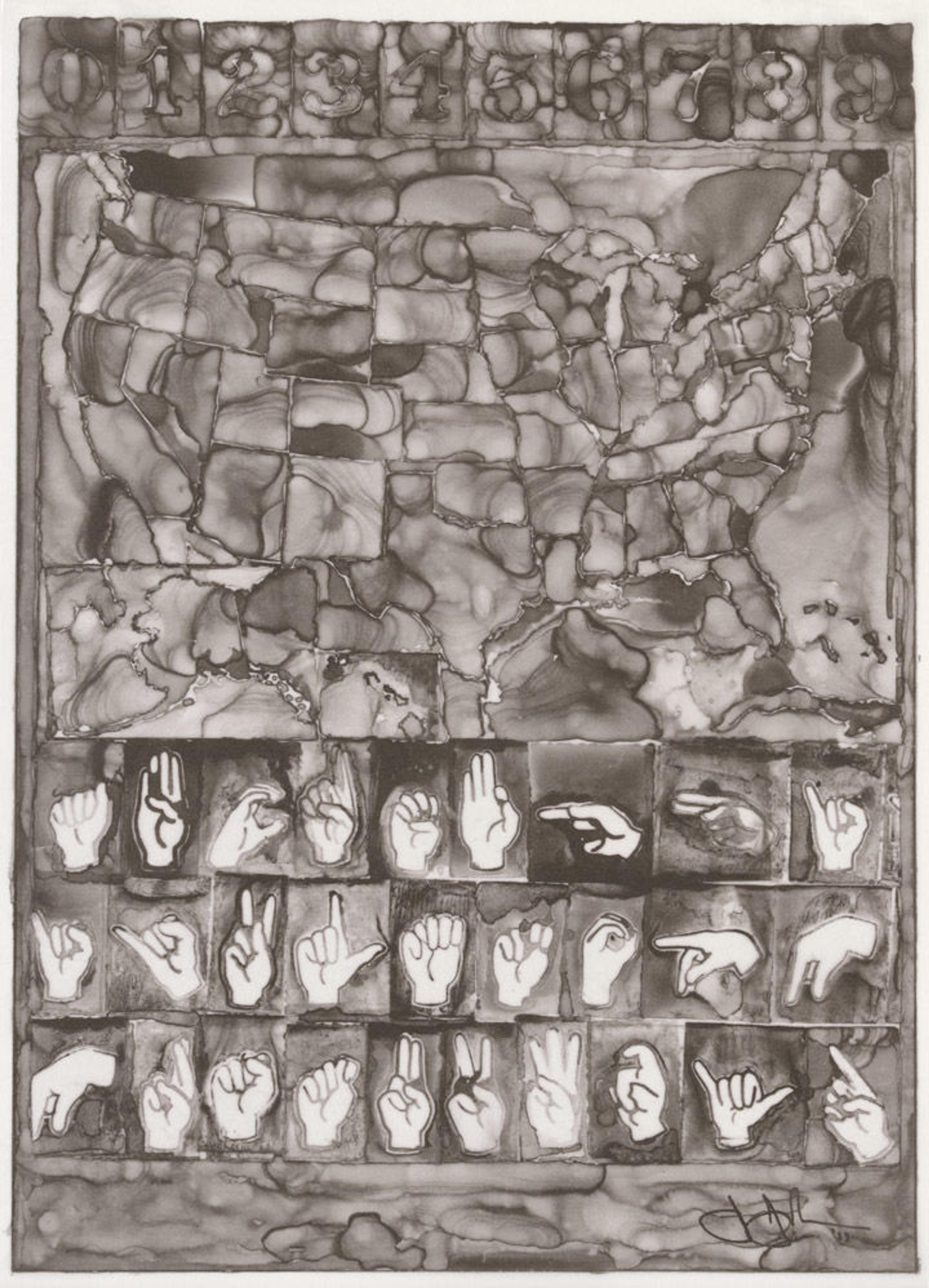 Johns has revealed a continued engagement with the nature of perception and the ways in which thoughts are constructed and communicated. Made in 2013, Untitled is composed of three distinct bands containing motifs found in his art throughout the decades: the top register houses numbers running from zero to nine, the center features a map of the United States, and the bottom presents letters in American Sign Language. The irregular gray and black tones and pools of ink represent Johns's attempt to capture the aesthetic of ink on plastic—a material he has depicted in his drawings since 1962—in a print.