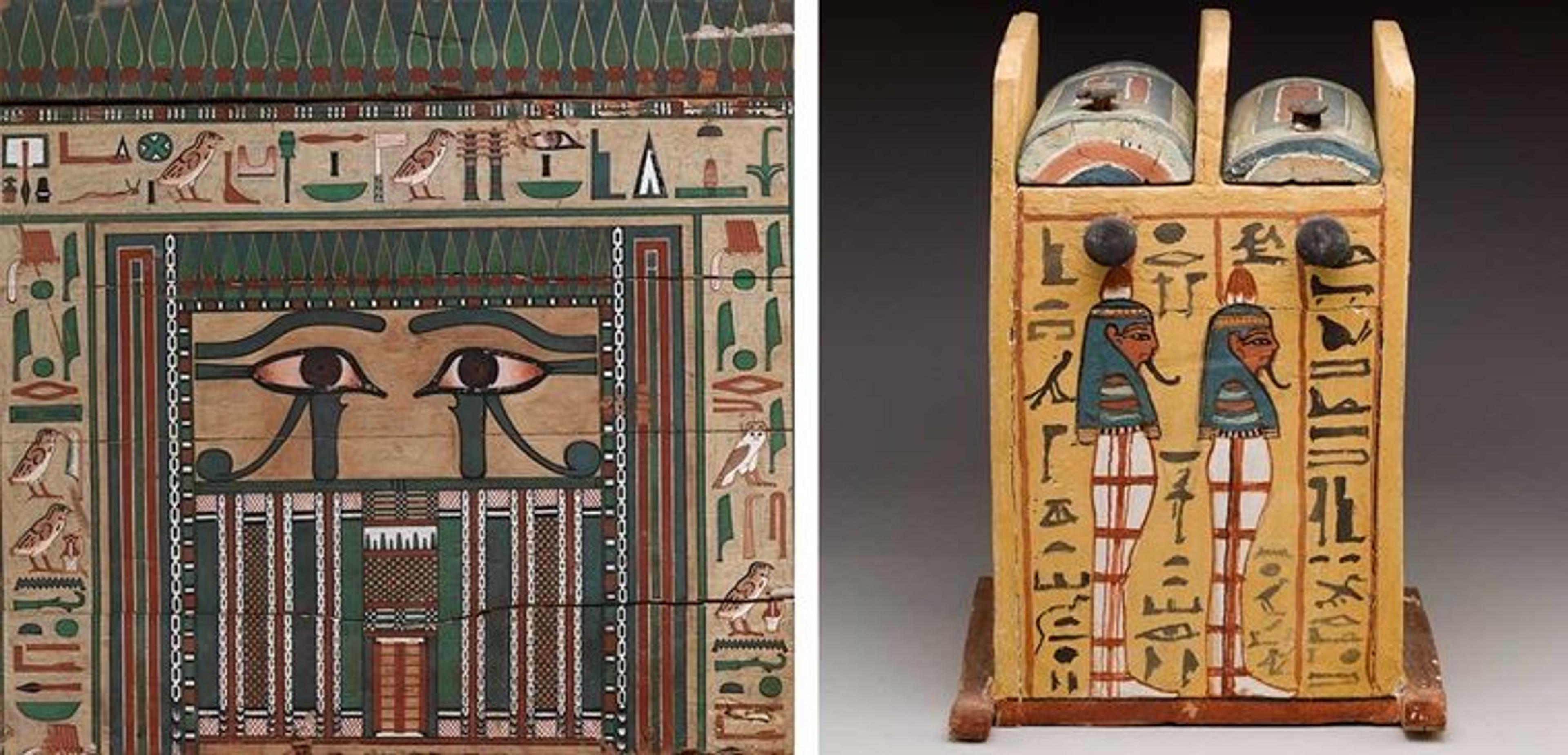 Two examples of paintings on wooden objects from ancient Egypt. Left: Coffin of Khnumnakht (detail), ca. 1802–1640 B.C. From Egypt. Wood, paint, 81 11/16 x 20 3/8 x 26 3/4 in. (207.5 x 51.8 x 68 cm). The Metropolitan Museum of Art, New York, Rogers Fund, 1915 (15.2.2a, b) | Right: Shabti box of Paramnekhu, ca. 1279–1213 B.C. From Egypt. Wood, gesso, paint, 11 1/4 x 8 1/4 x 6 5/16 in. (28.5 x 20.9 x 16 cm). The Metropolitan Museum of Art, New York, Funds from various donors, 1886 (86.1.14a-c)