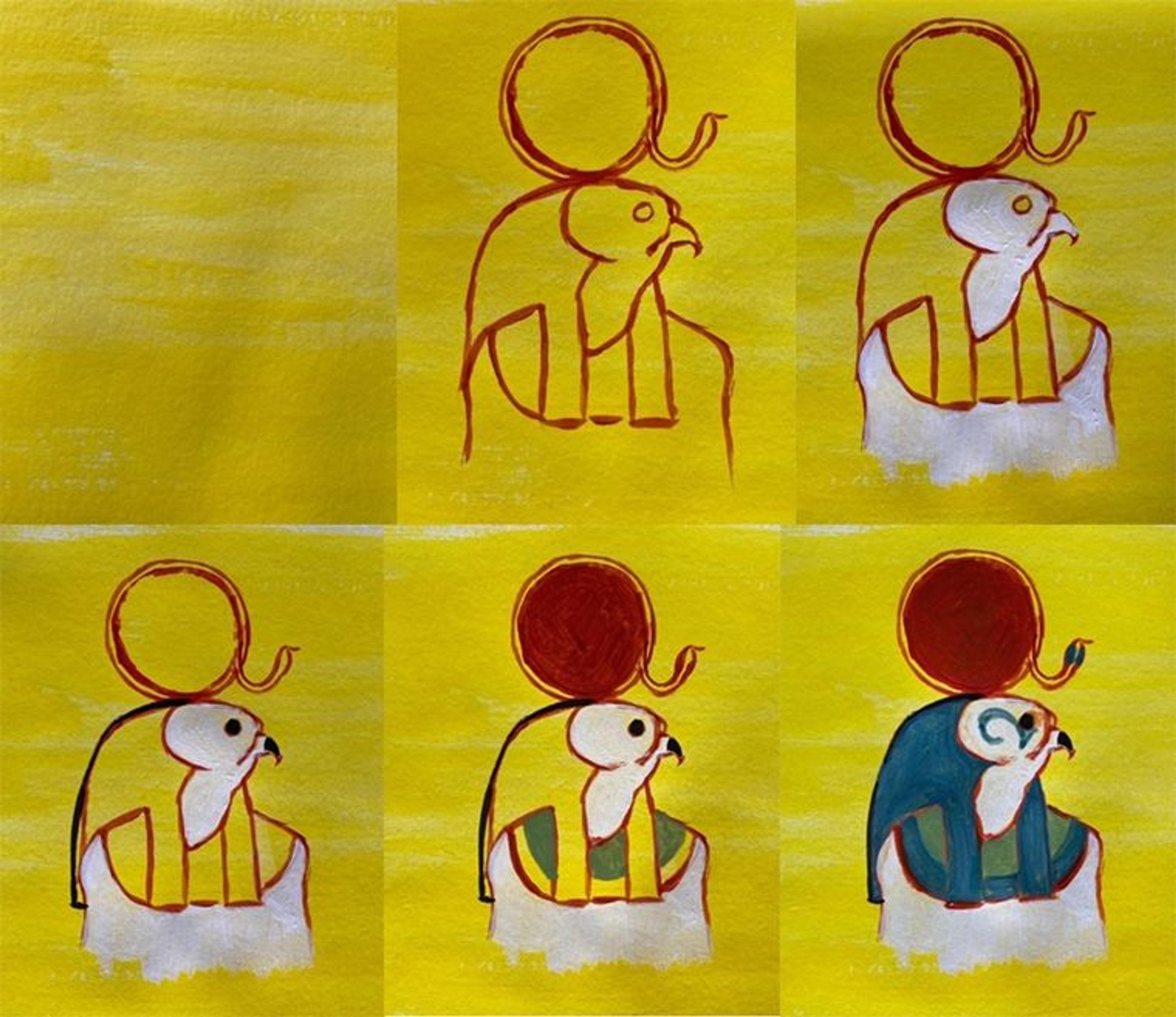 Next, let’s get painting. You’ll need the brushes you just made ("modern" brushes will do, too), paint of any type, and a piece of paper or wood. Now it's your turn to have fun painting like an ancient Egyptian! This is a step-by-step painting of the sun god with the head of a falcon. Do you recognize this sun god from any of the art above?