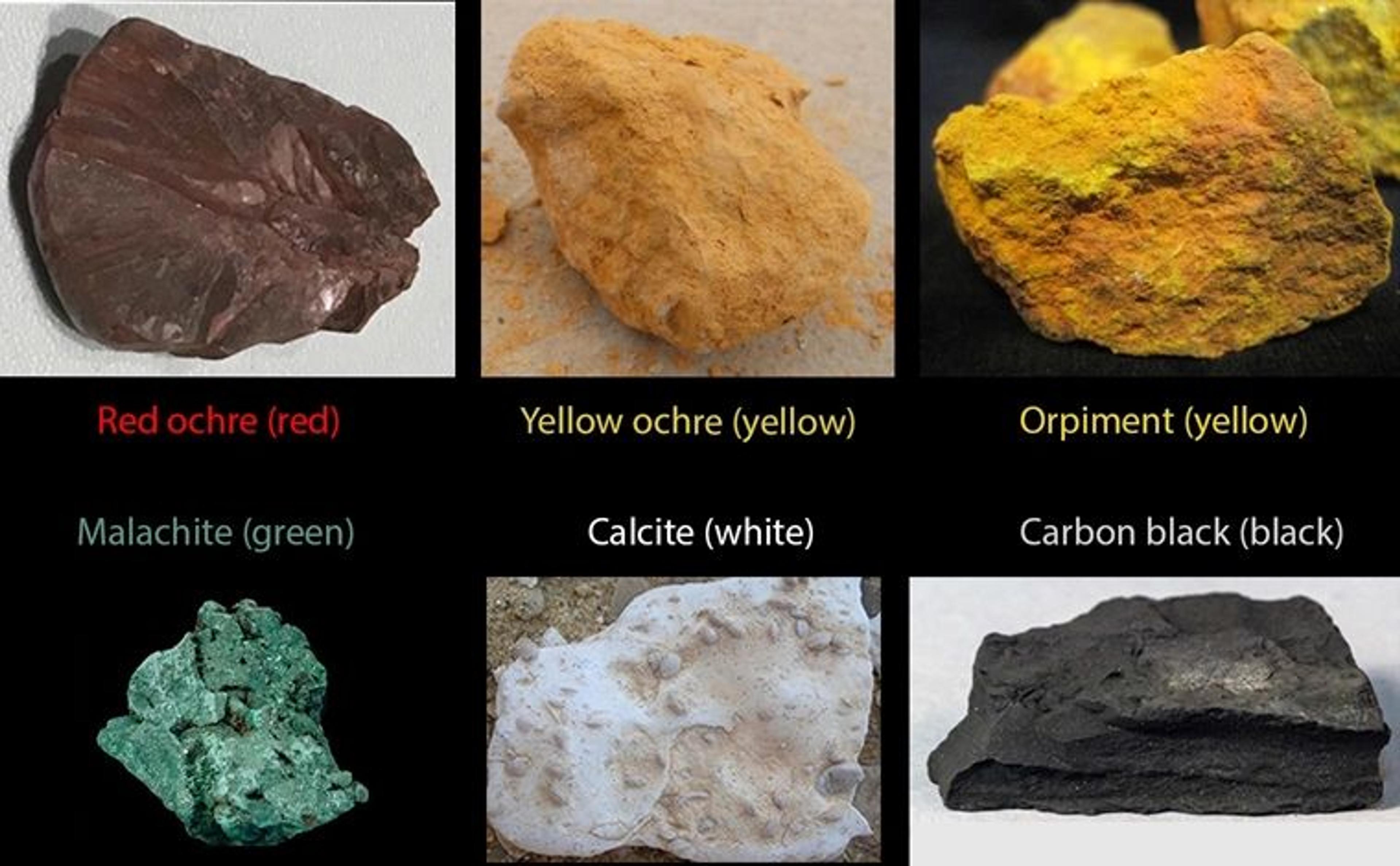 Clockwise from top left: red ochre, image courtesy of Hilary Becker, Binghamton University; yellow ochre, image courtesy of Ruth Siddall, University College London; orpiment, image courtesy of Ruth Siddall; carbon black, image courtesy of Caroline Roberts and photographed by Randy Stegmeyer/Ann Asplund for Ancient Color, a special exhibition at the Kelsey Museum of Archaeology; calcite in the form of chalk, image courtesy of Ruth Siddall and Charlie Underwood; and malachite, image courtesy of Caroline Roberts and photographed by Randy Stegmeyer/Ann Asplund for Ancient Color, a special exhibition at the Kelsey Museum of Archaeology