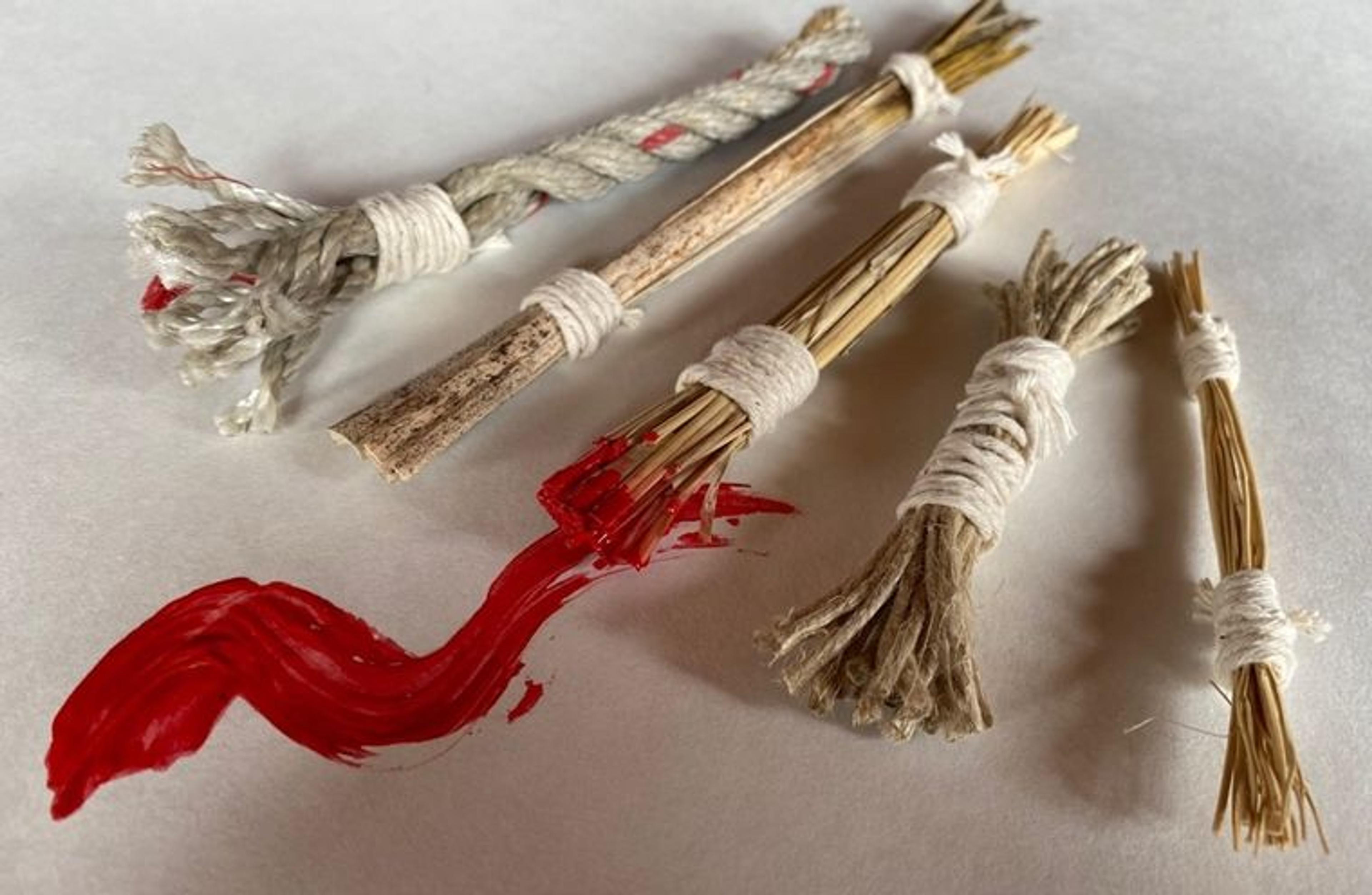 Here are some ideas for natural or household materials you can use to create a brush: broom bristles, dry grass, reeds, a stick with frayed ends, string, rope, straw, or anything else you can find that will hold paint!